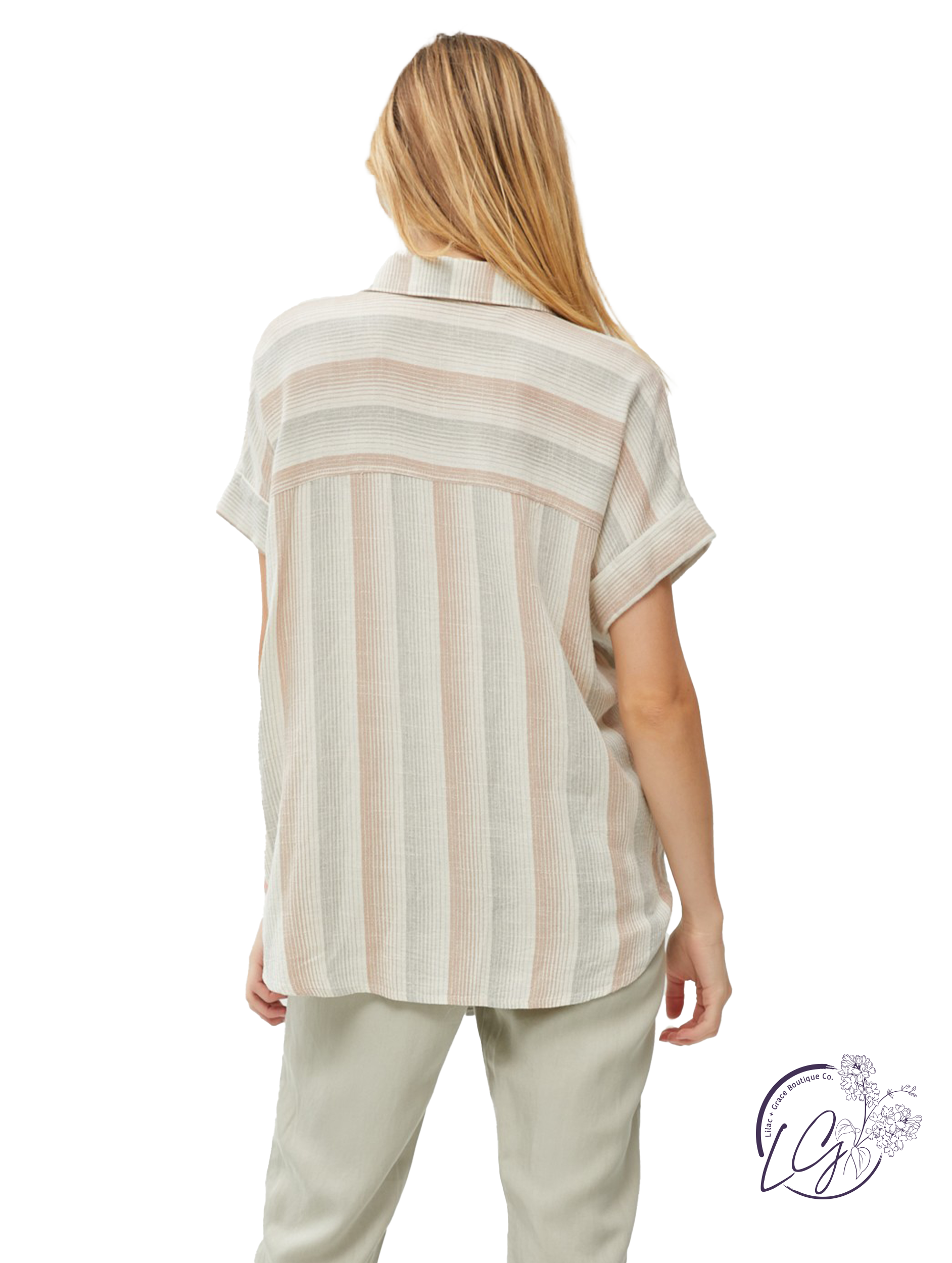 Upgrade your casual look with the Marina Stripe Shirt. Featuring classic stripes, short doman sleeves, and a trendy chest pocket, this button down shirt is perfect for any casual occasion. Roll up the cuffs for a laid-back look and enjoy the relaxed fit and round hemline.