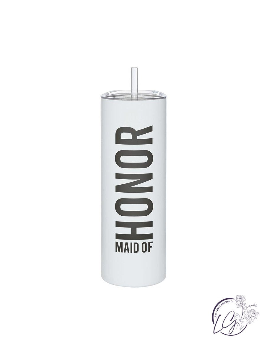 The Matte Skinny Tumbler - Maid of Honor is a stylish and elegant drinkware accessory designed to celebrate the special role of the Maid of Honor in a wedding. This slender and chic tumbler boasts a matte finish, giving it a sophisticated and modern aesthetic. The sleek design is not only visually appealing but also practical, making it easy to hold and carry.