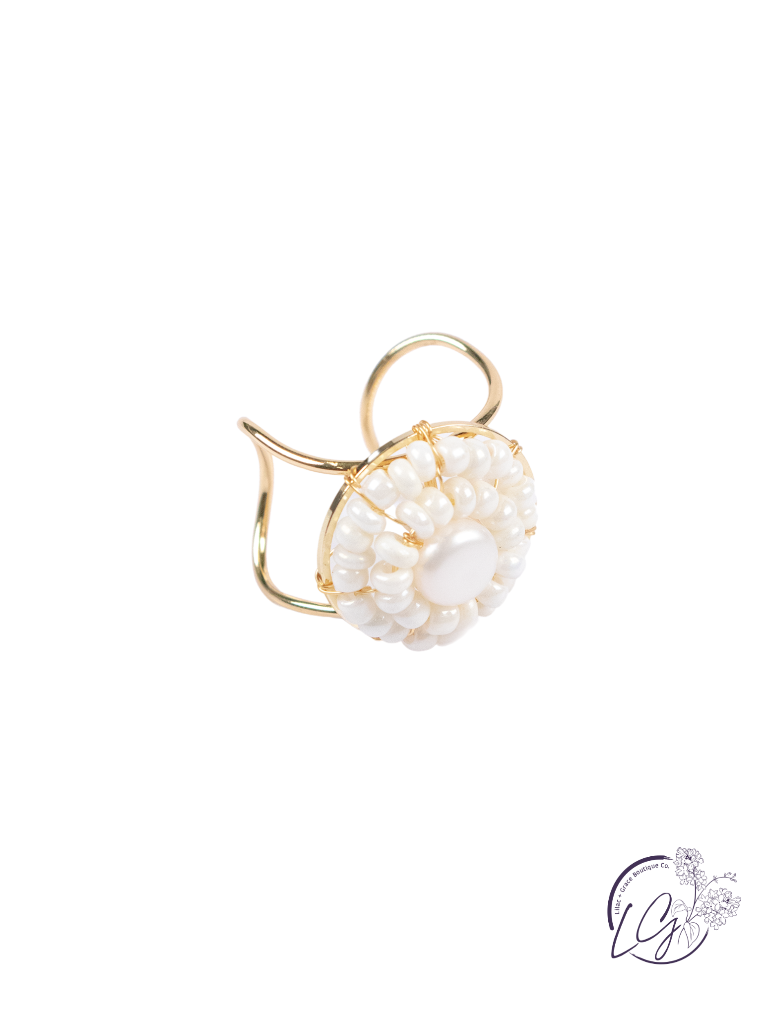 Elevate your look with this Meghan Browne Style statement ring, designed with sophistication and charm. Featuring a radiant gold-tone band, this piece showcases a beautifully arranged cluster of pearl-like beads, creating a bold and elegant aesthetic. The luminous beads add depth and dimension, offering a refined touch that pairs effortlessly with both formal and casual outfits.