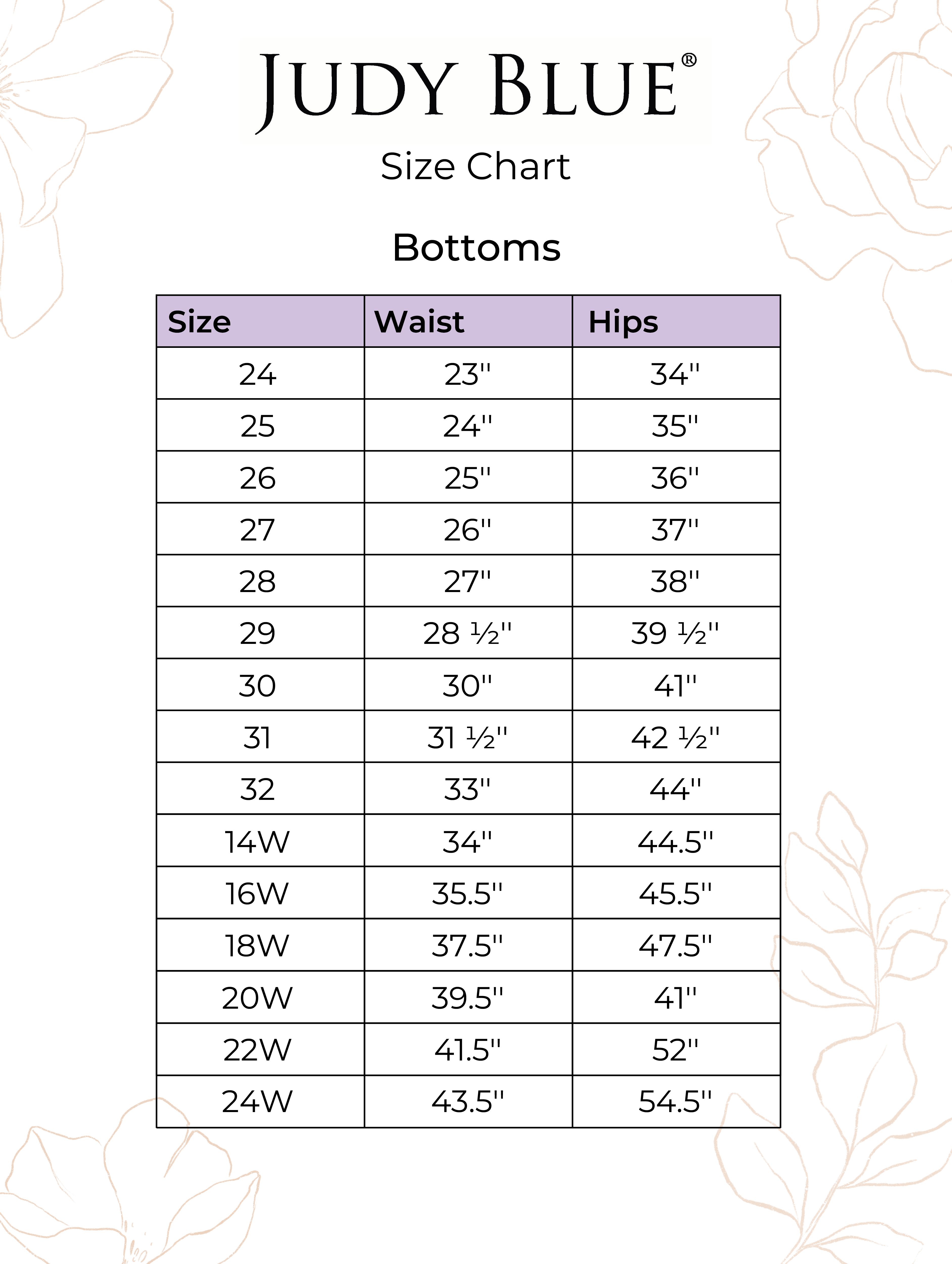 *Judy Blue jeans have a roomy fit, so we recommend sizing down one from your usual department size.
