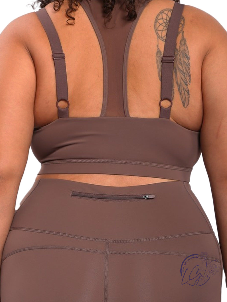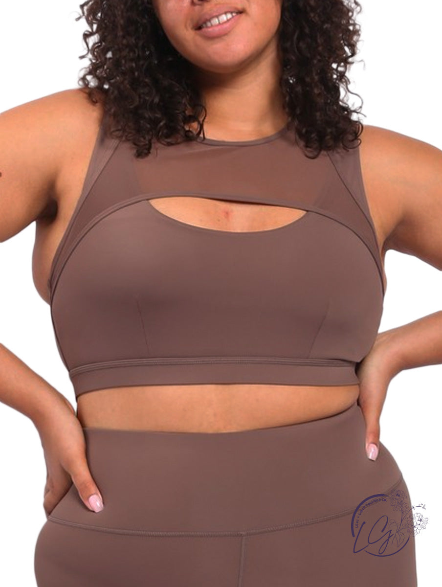 This edgy, eco-friendly sports bra features a harness-like mesh front that forms a racer silhouette on the back, as well as opaque classic-cut sports bra with adjustable bra straps.