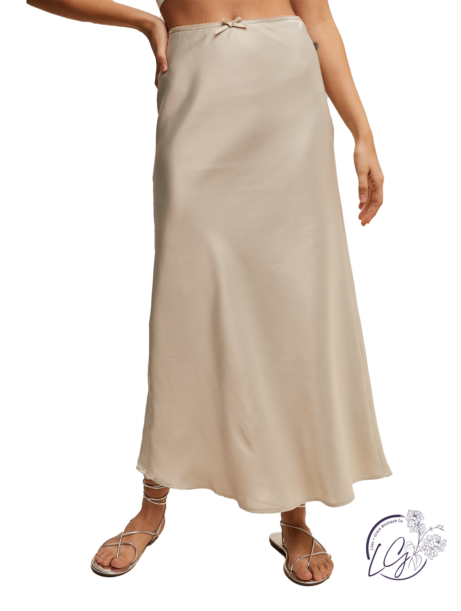 Effortlessly chic and timeless, this satin midi slip skirt exudes elegance with every step. Its smooth satin finish catches the light beautifully, while delicate details add a touch of charm. Whether styled for day or night, this piece is a must-have for refined, versatile fashion.