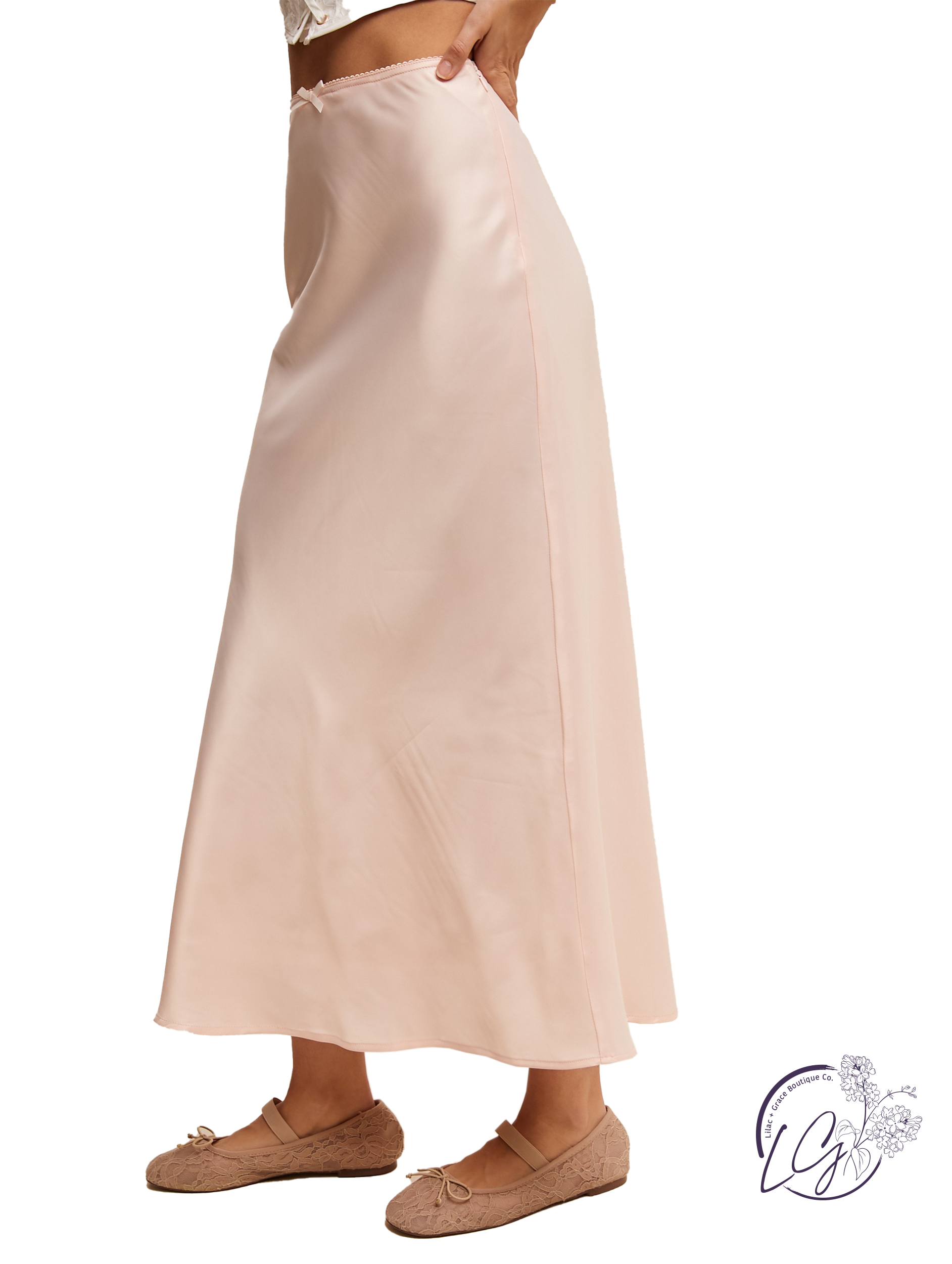 Effortlessly chic and timeless, this satin midi slip skirt exudes elegance with every step. Its smooth satin finish catches the light beautifully, while delicate details add a touch of charm. Whether styled for day or night, this piece is a must-have for refined, versatile fashion.