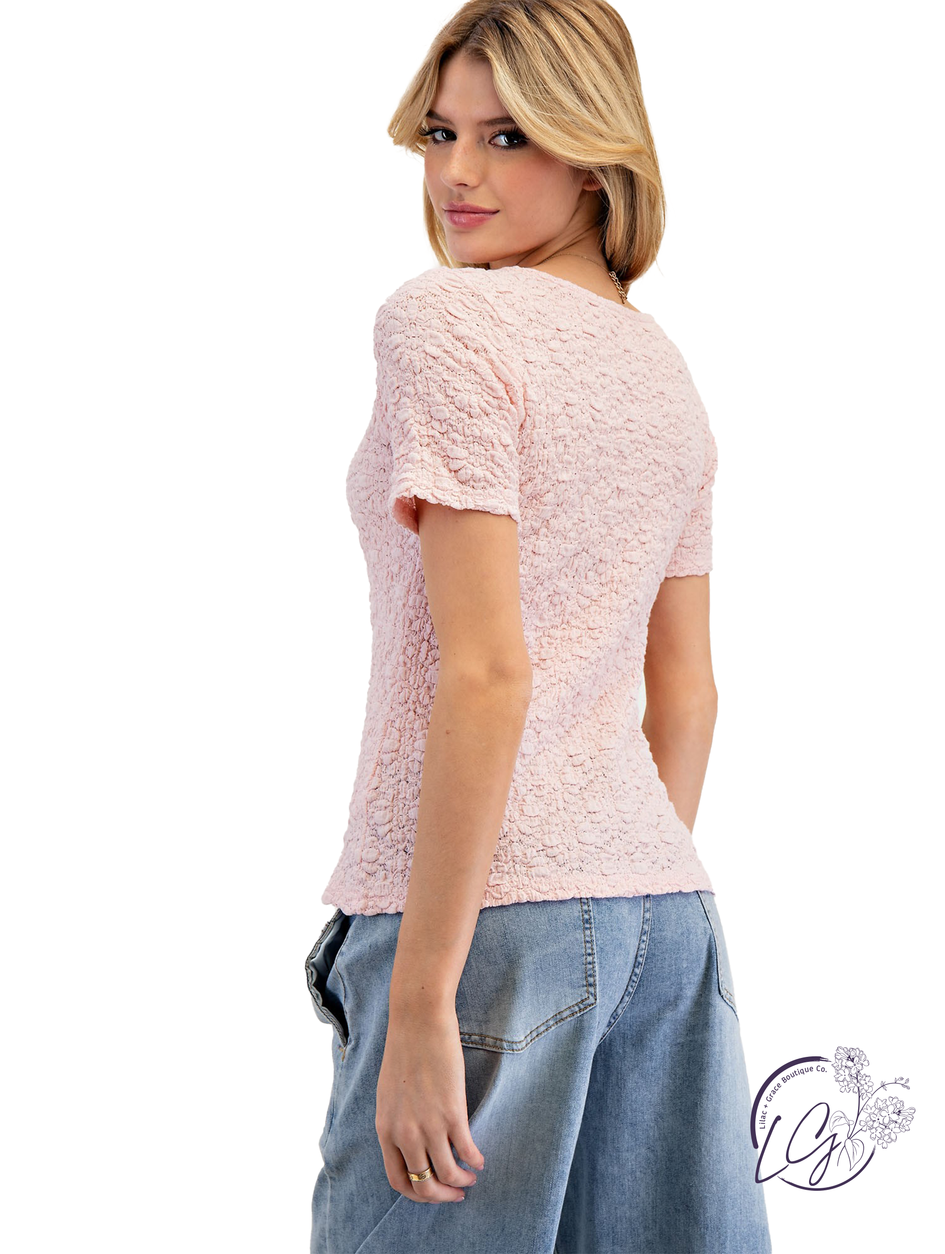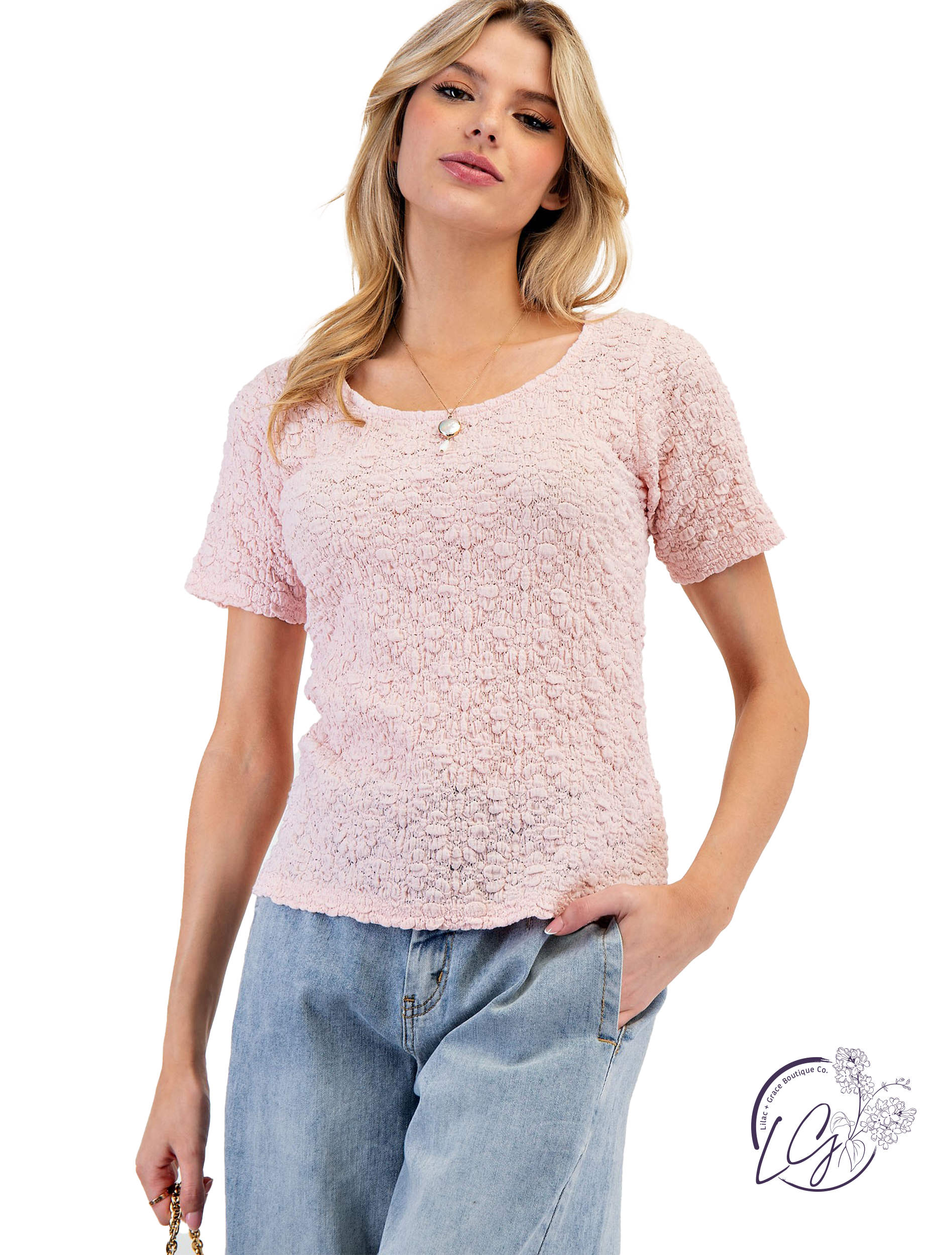 This allover lace top features a form-fitting silhouette with a rounded neckline and short sleeves, crafted from a textured lace fabrication that’s slightly sheer for a delicate, layered look.