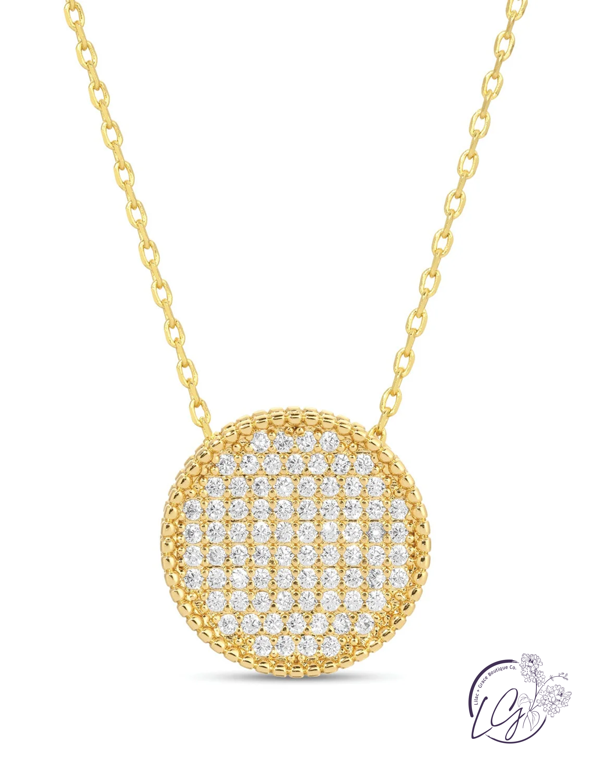 This elegant necklace features a delicate circle adorned with sparkling cubic zirconia, complete with a chain that threads through the center.