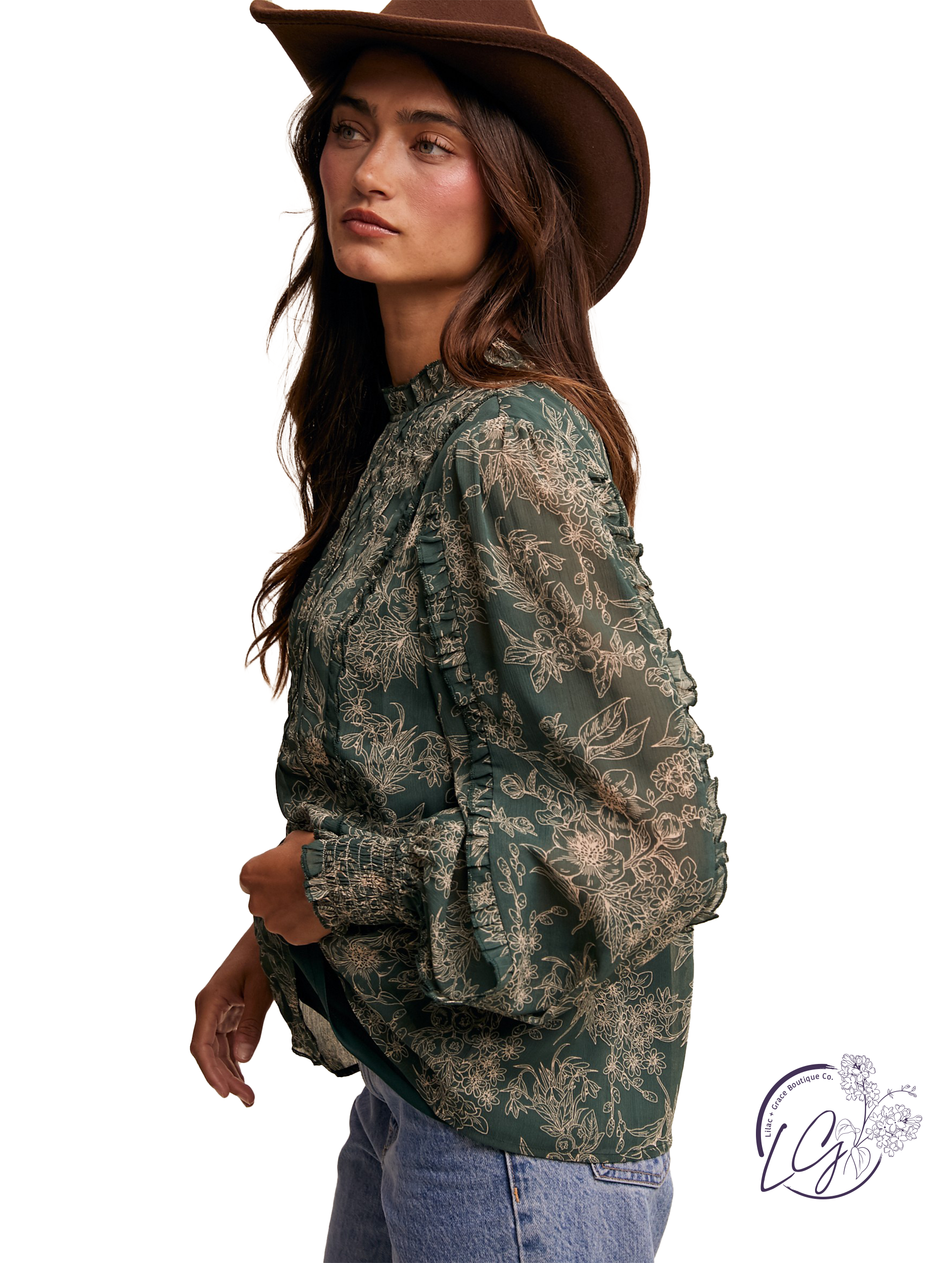 Embrace effortless elegance with the Petal Pleat Top. This floral print blouse features a charming ruffle neck and a keyhole closure at the back for a delicate touch. The pleated design, enhanced with ruffles on the front body and sleeves, adds a playful yet sophisticated flair. Long sleeves with smocked cuffs create a flattering silhouette, while the clean hem and lining provide a polished finish. Perfect for both casual and dressy occasions, this top is a versatile addition to your wardrobe