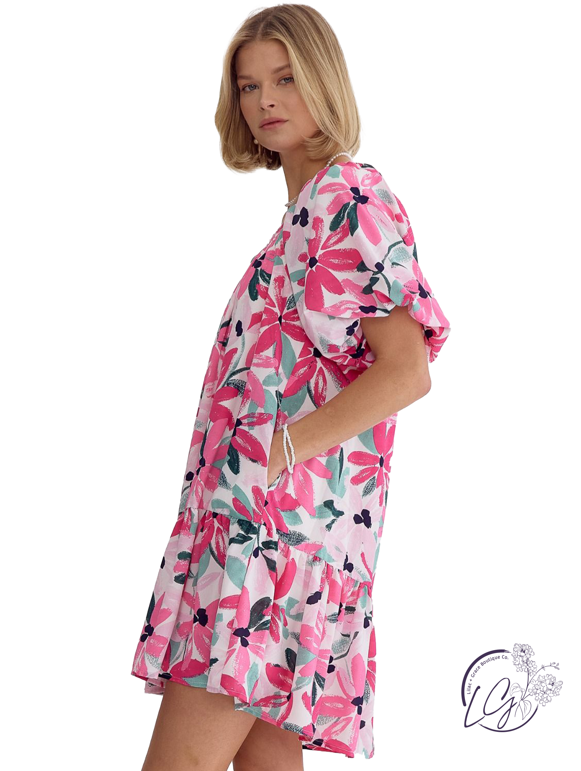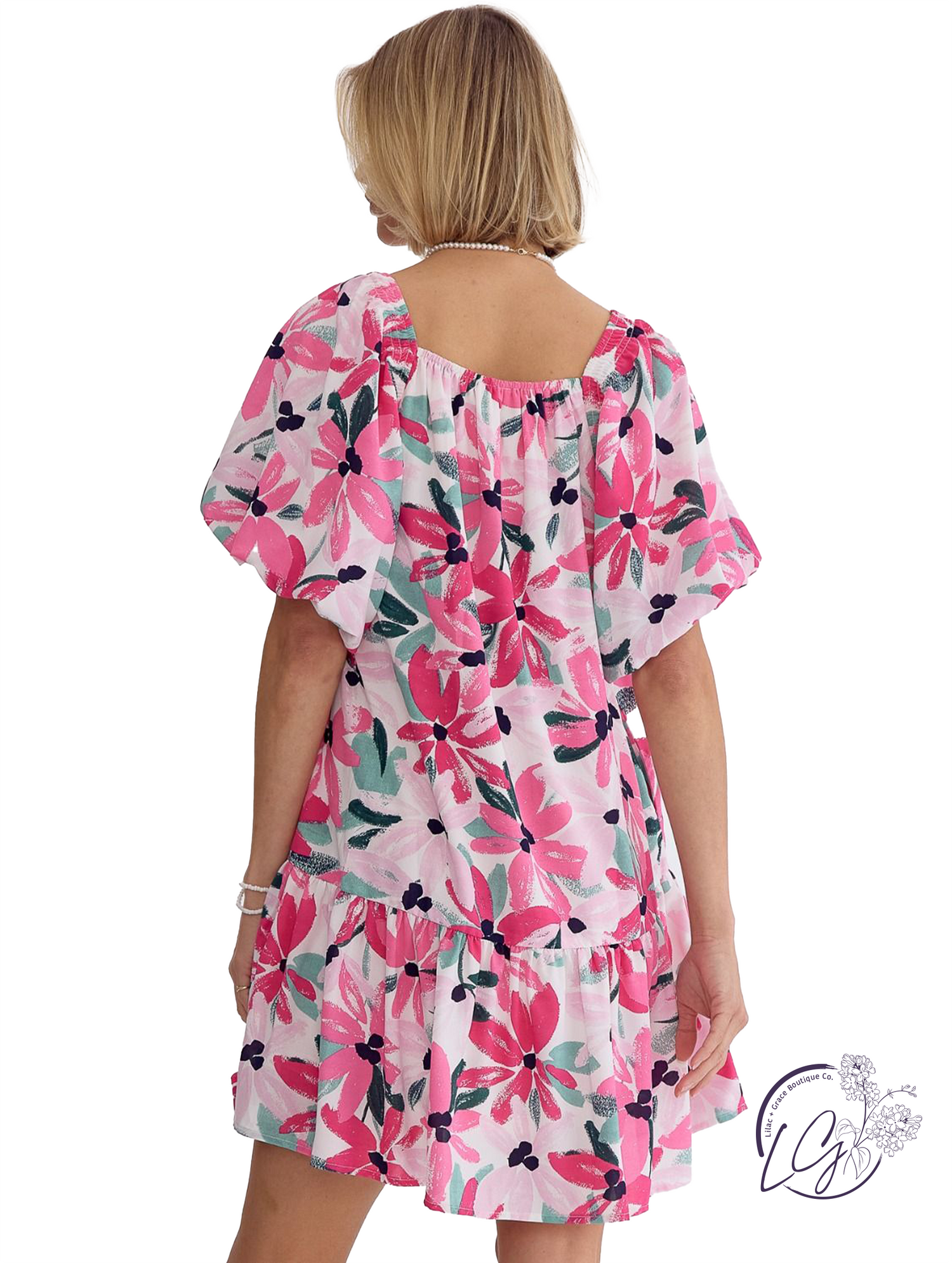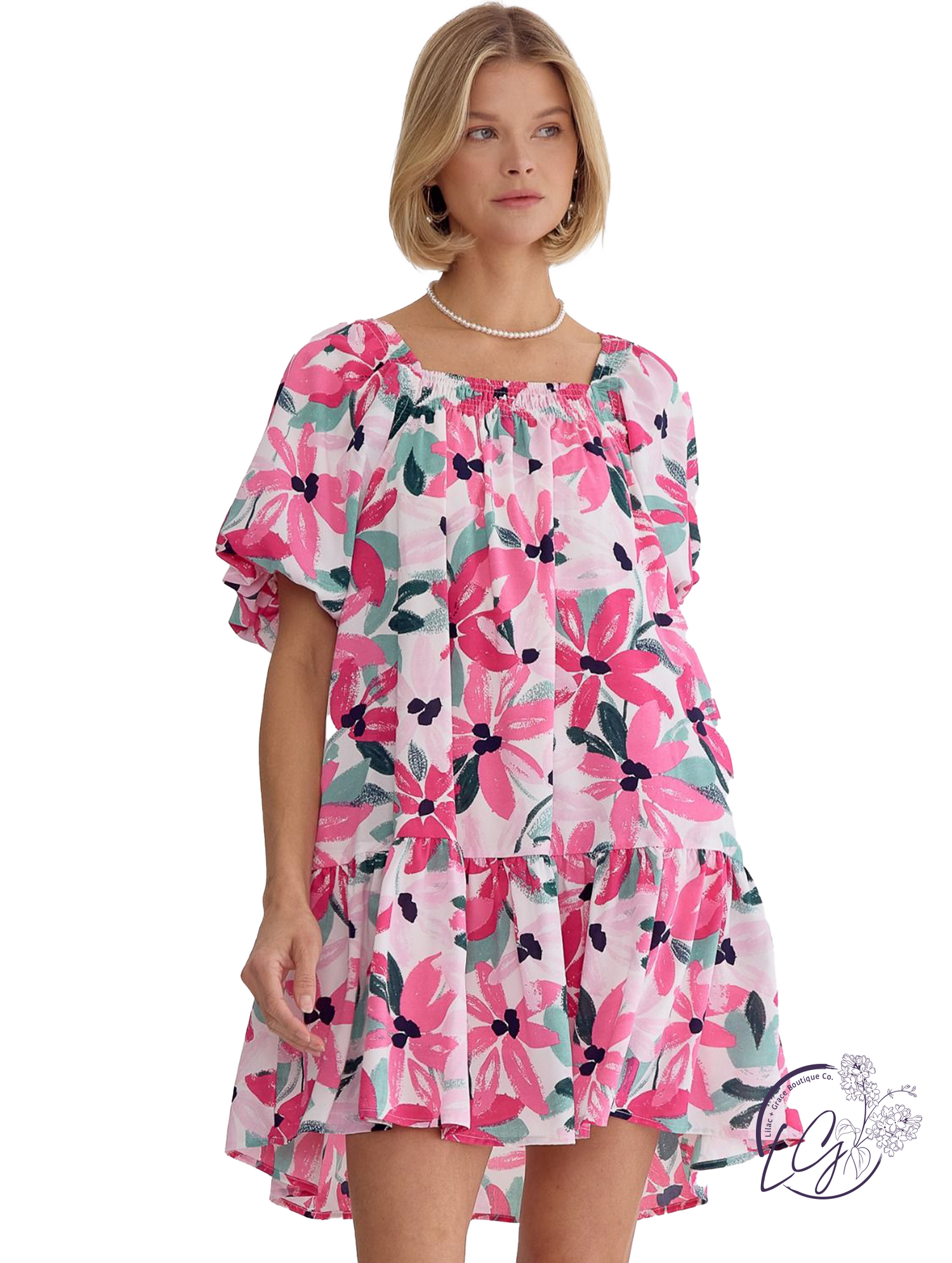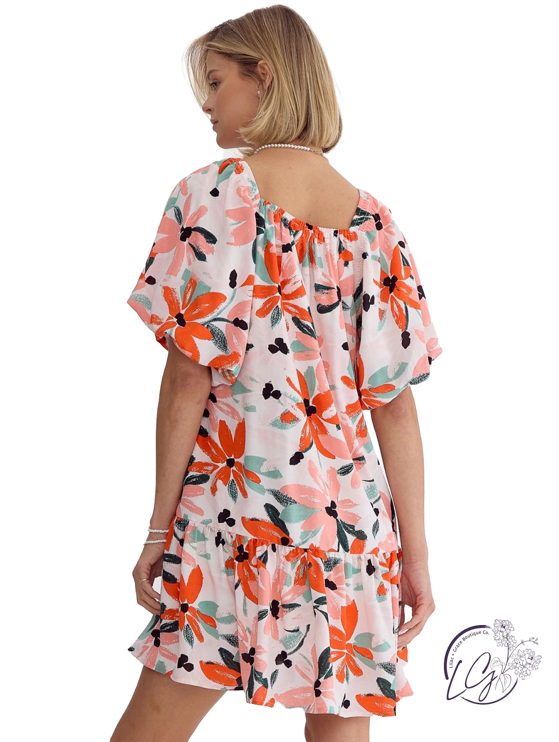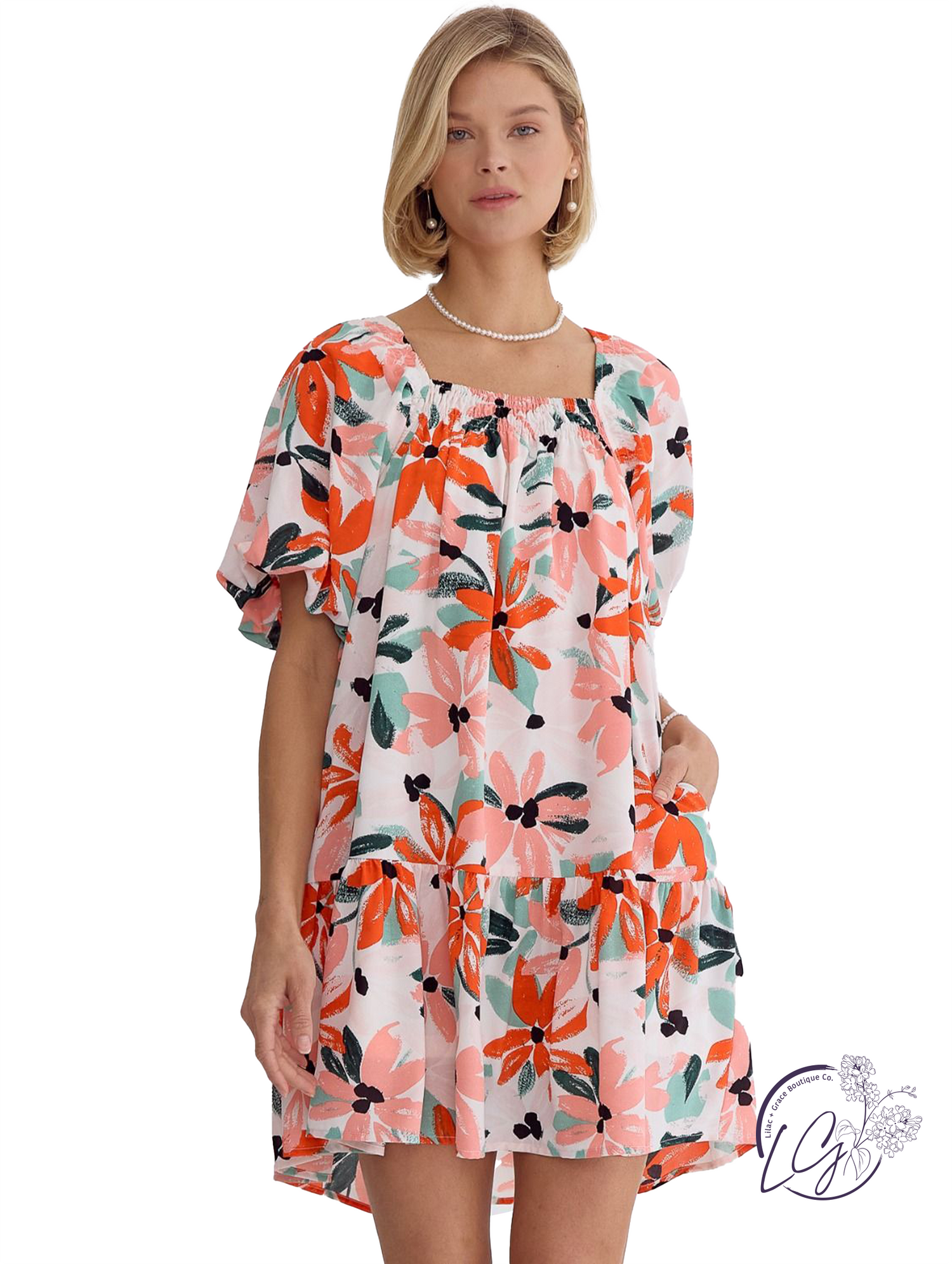 This floral print mini dress features a square neckline with elasticized detailing for comfort and flexibility. Short sleeves add a soft, balanced shape, while the mini length keeps the silhouette fresh and playful. Lightweight and easy to wear, it’s perfect for warm days—just pair with sandals or sneakers for a relaxed, styled look.