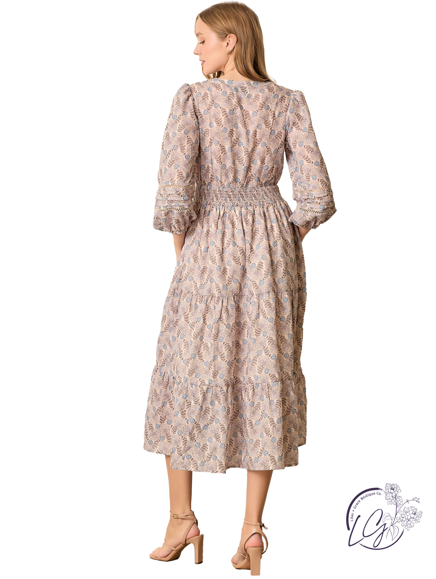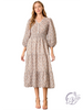 This floral print midi dress features a flattering V-neckline and soft half sleeves for a balanced, feminine silhouette. The mid-length cut offers easy movement, while the lightweight fabric makes it perfect for warm-weather wear. Pair it with sandals or flats for an effortless daytime look.