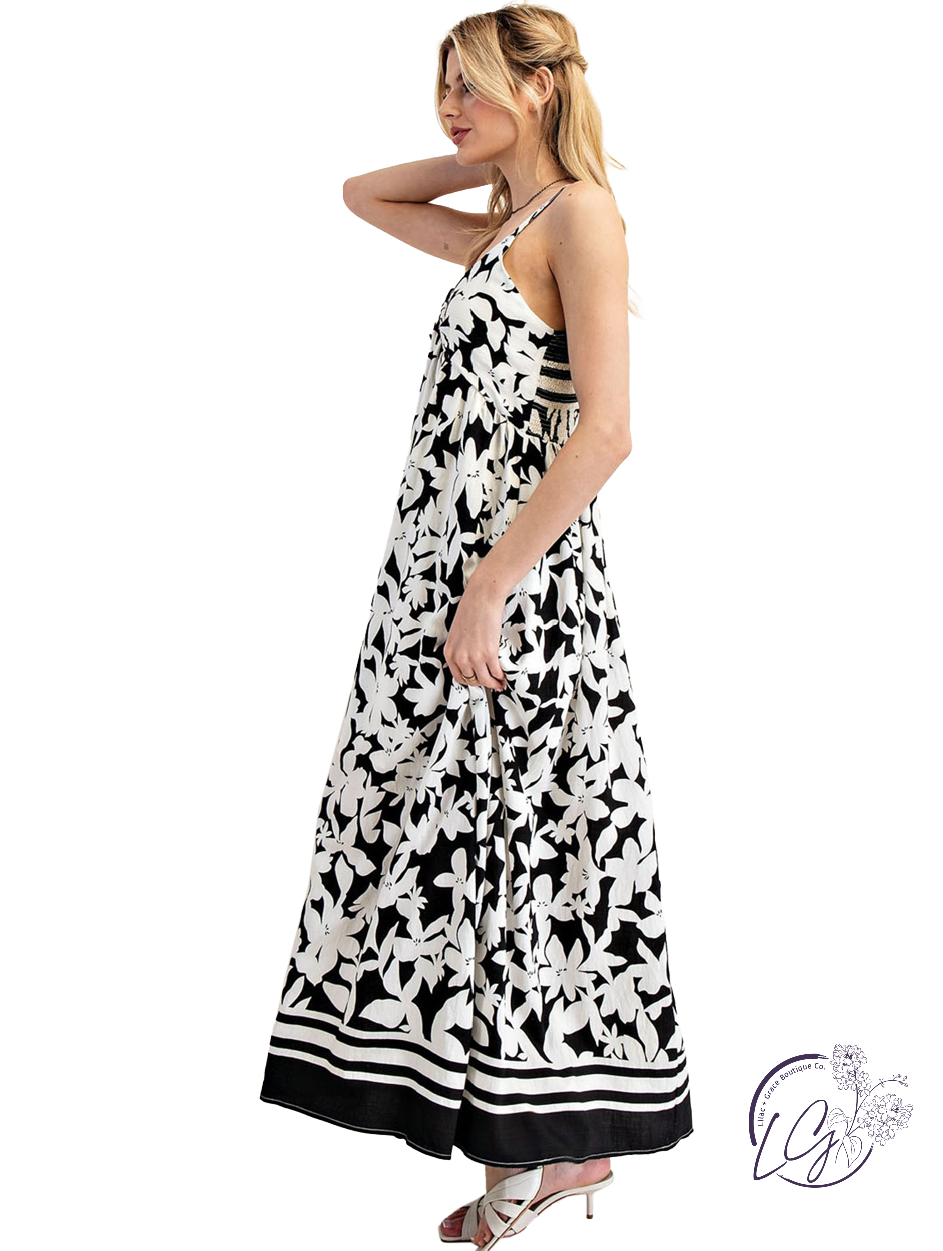 This floral printed sleeveless maxi dress features a flattering V-neckline, adjustable spaghetti straps, and a smocked back for a flexible, comfortable fit. The breezy skirt flows with ease, finished with a contrast border that adds a bold, eye-catching detail. Perfect for vacation days or sunny afternoons—just add sandals and simple accessories for a relaxed, polished look.