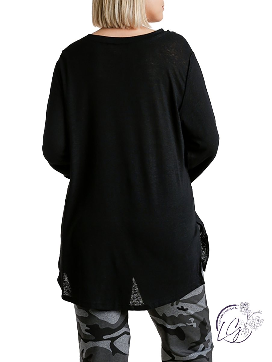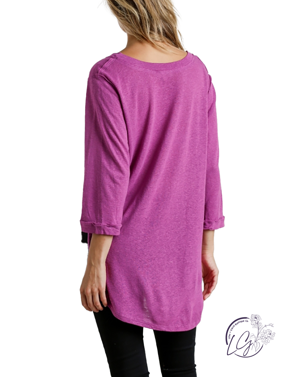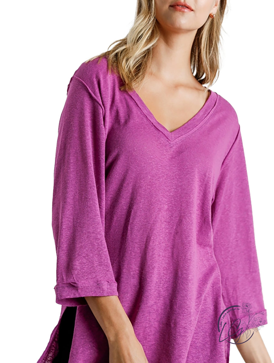 V-Neck 3/4 Sleeve Raw Edge Detail Top with Side Slits and High Low Hem