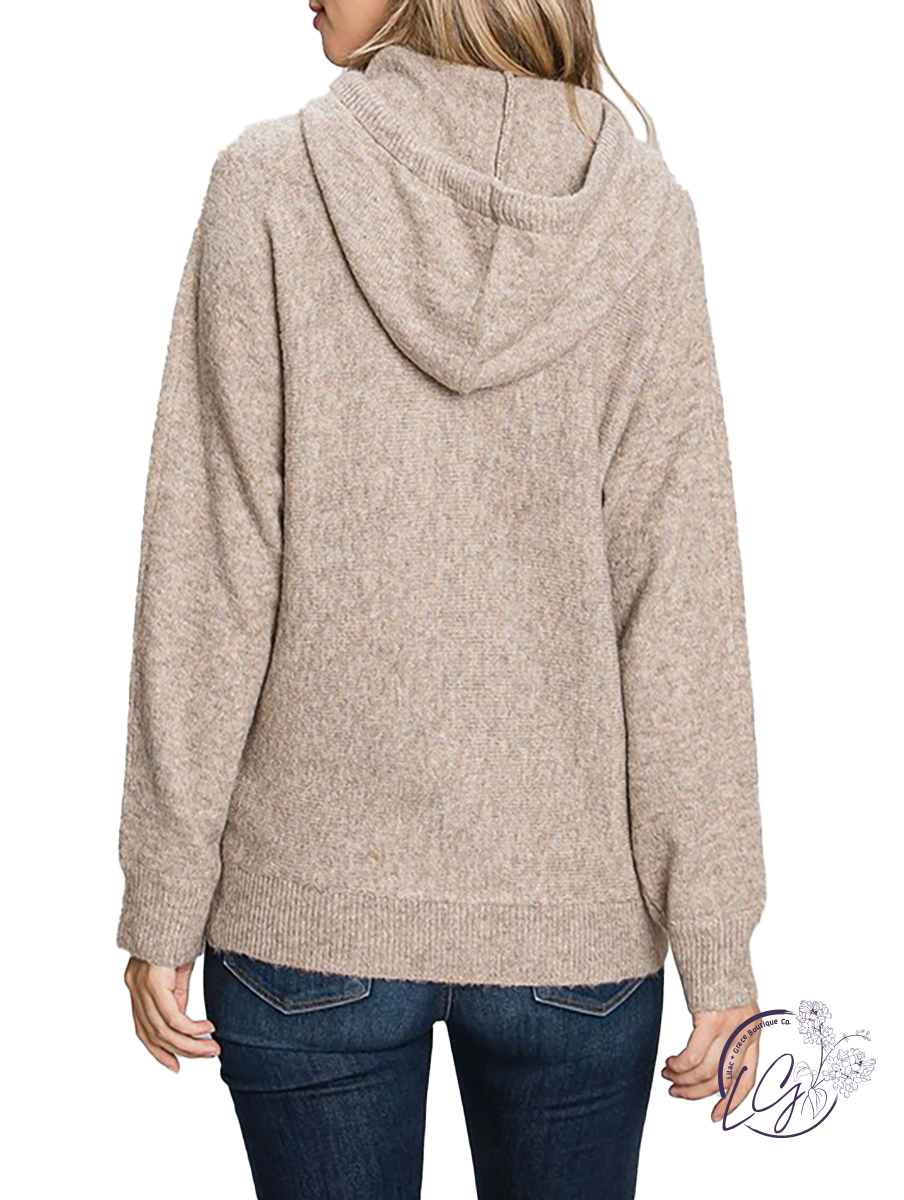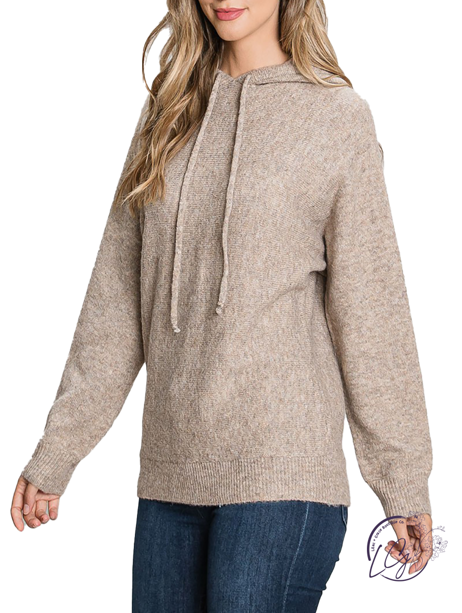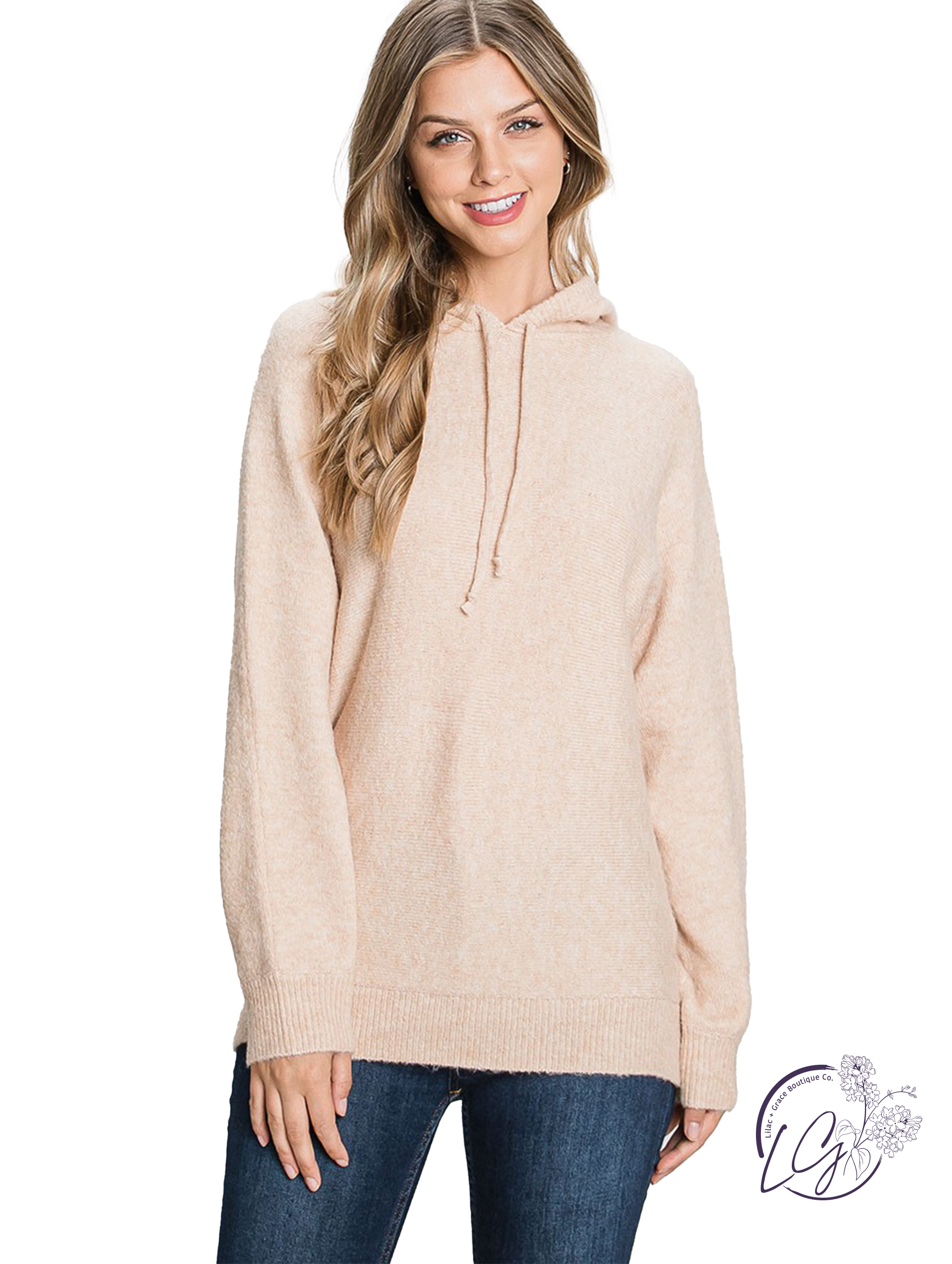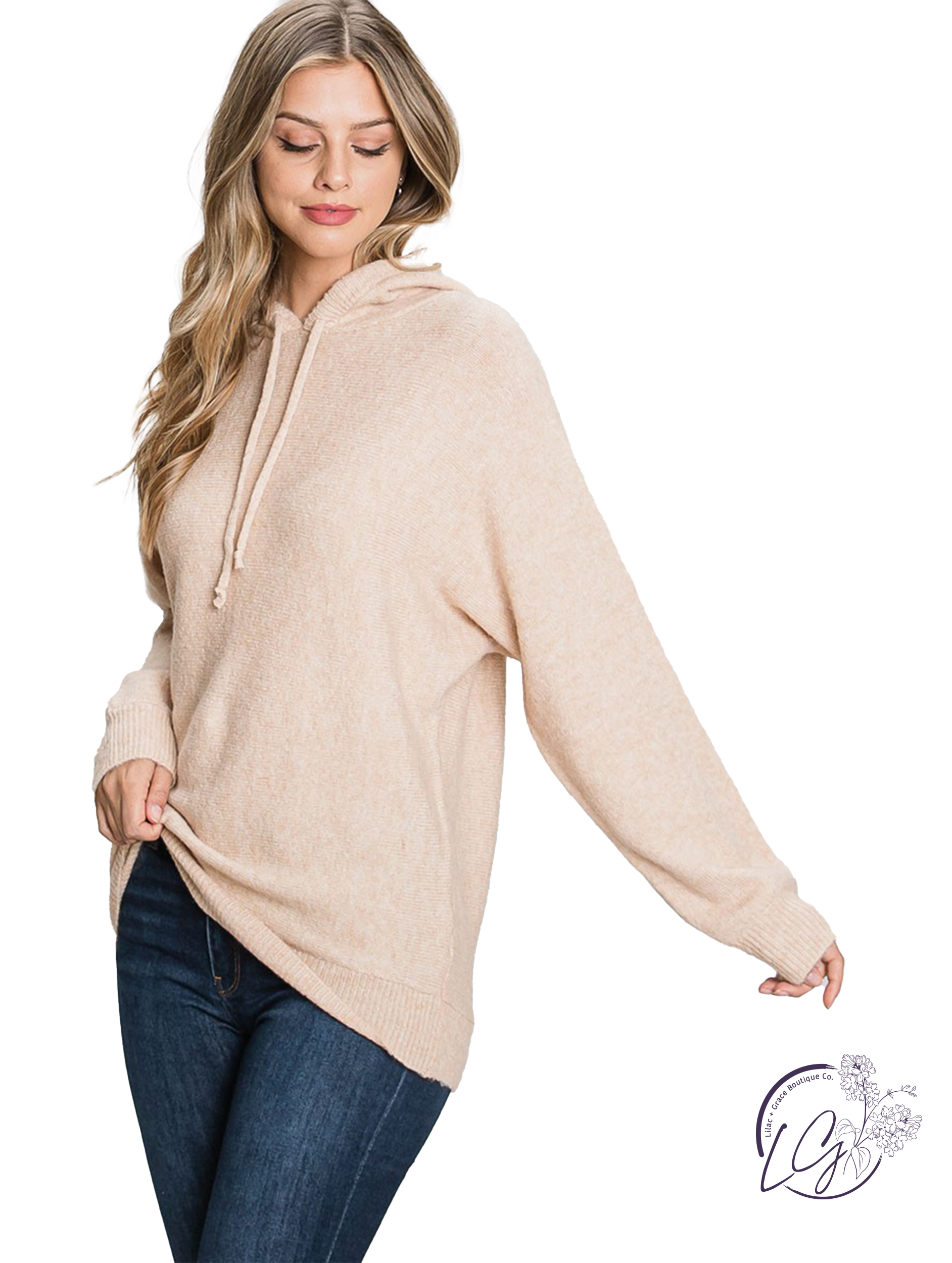 Hoodie Sweater with long sleeves and drawstring. Features a slightly loose fit and dolman sleeves. This top is super soft and lightweight.