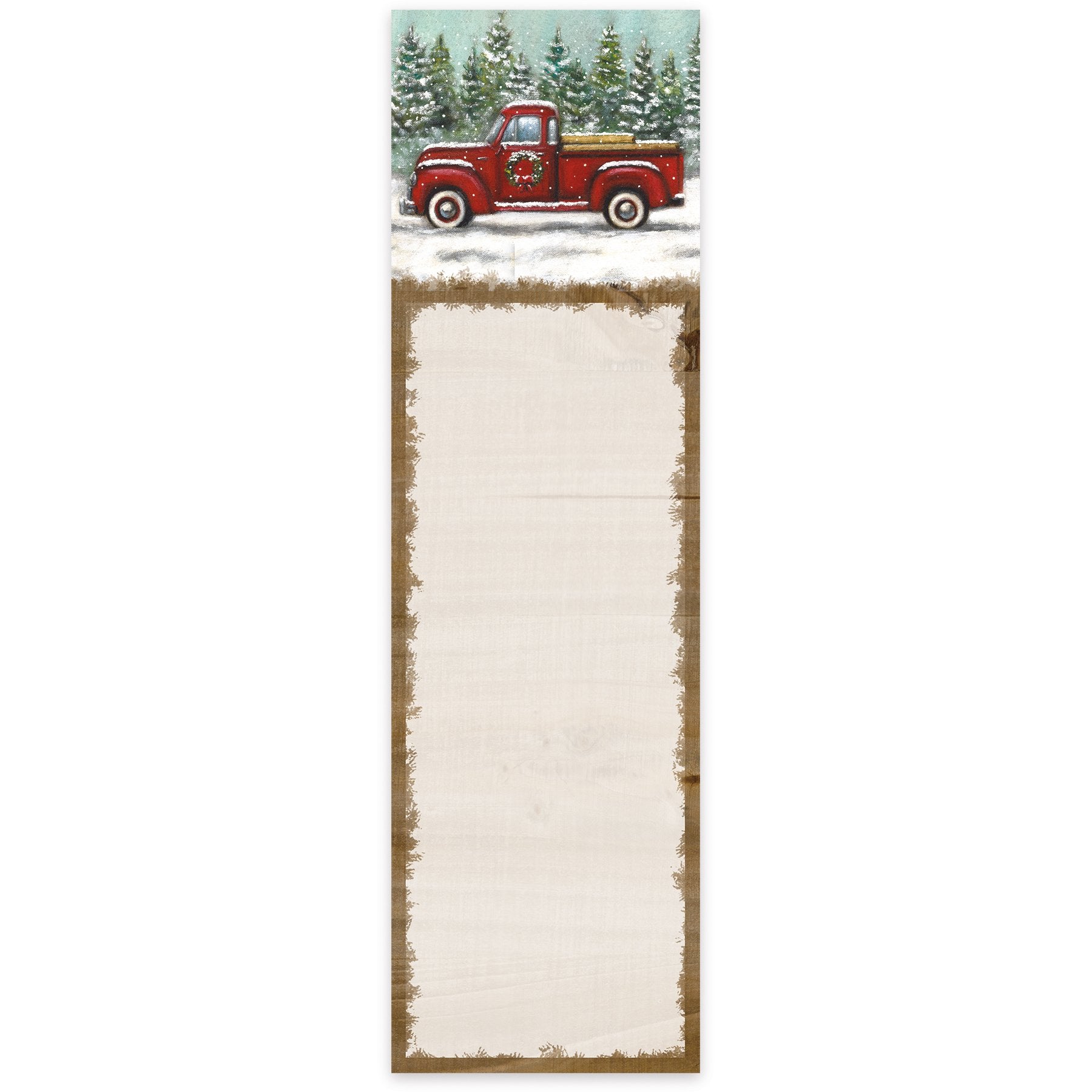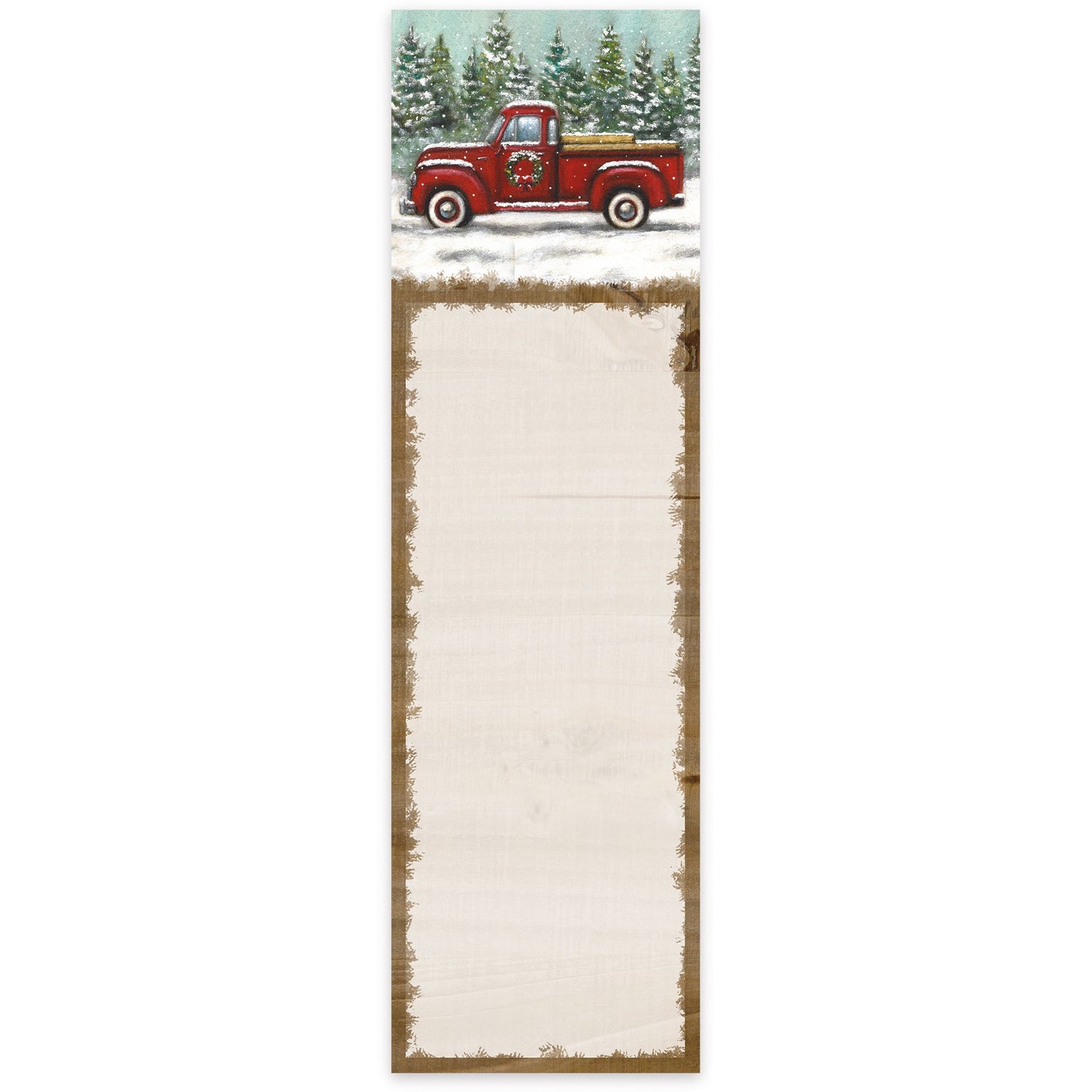 A list notepad featuring a wintry red truck design. Design is replicated from original artwork painted onto burlap canvas, giving the art a unique depth and texture. List notepad includes 60 pages and strong magnet.