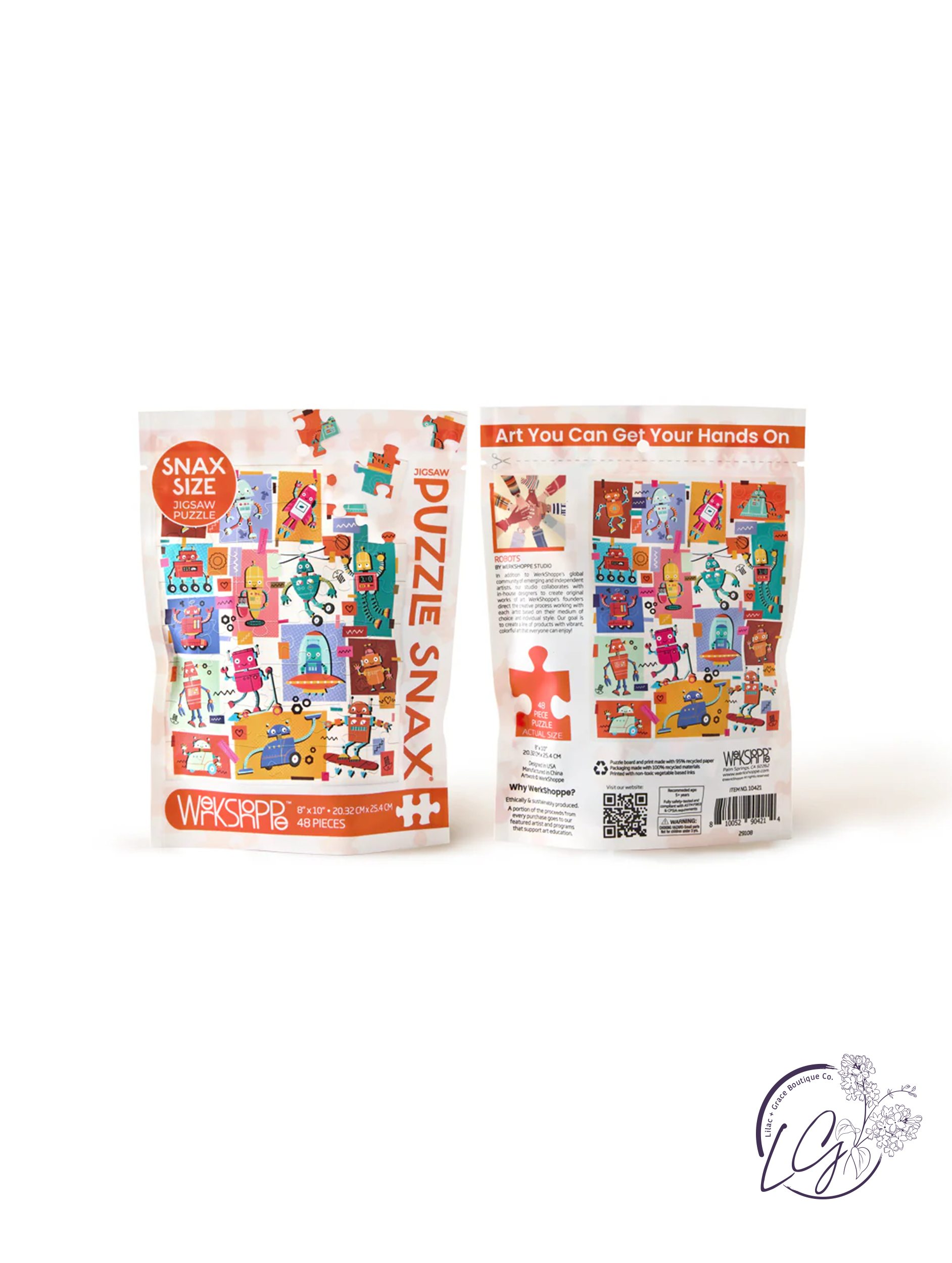 Explore the whimsical world of robots with our 48-piece Puzzle Snax, packed in a resealable pouch. Each piece showcases a colorful assortment of friendly robots, perfect for hands on problem-solving.