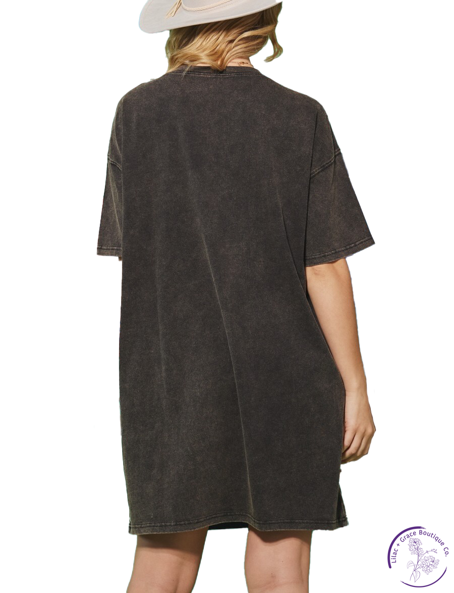 Step into the spotlight with our Rodeo Star Embellished Mini Dress! The washed solid fabric adds a touch of vintage charm while the star embellishments elevate your style. With short sleeves and a crew neck, this dress is both comfortable and stylish. Perfect for a rodeo, concert, or game day outfit. Be the star of the show in this mini dress!
