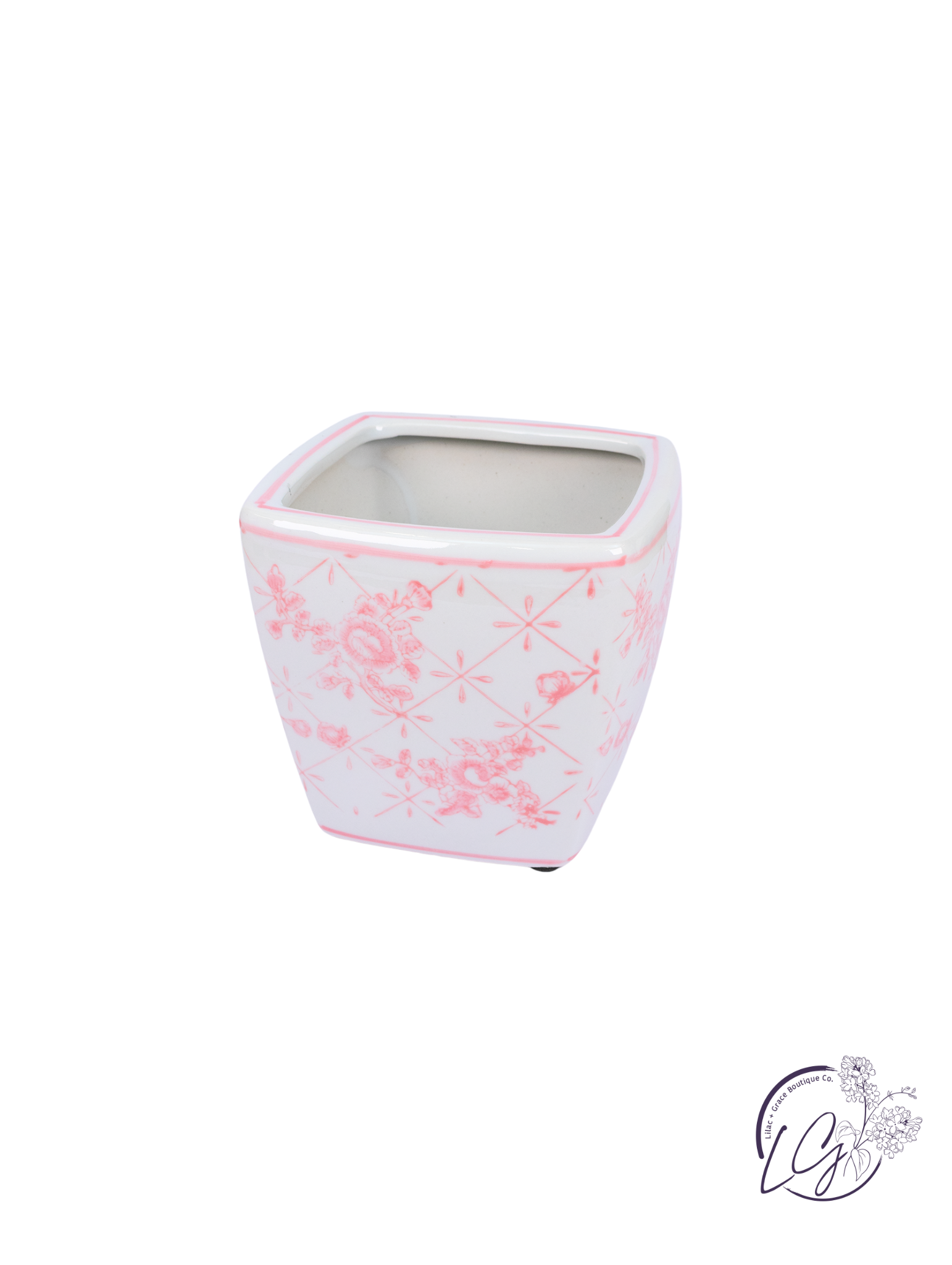This charming ceramic planter set features a vintage floral trellis design in soft green and rose pink hues. With a classic tapered square shape and glossy finish, they’re perfect for adding a touch of elegance to windowsills, shelves, or tabletops. Ideal for small plants, succulents, or herbs.
