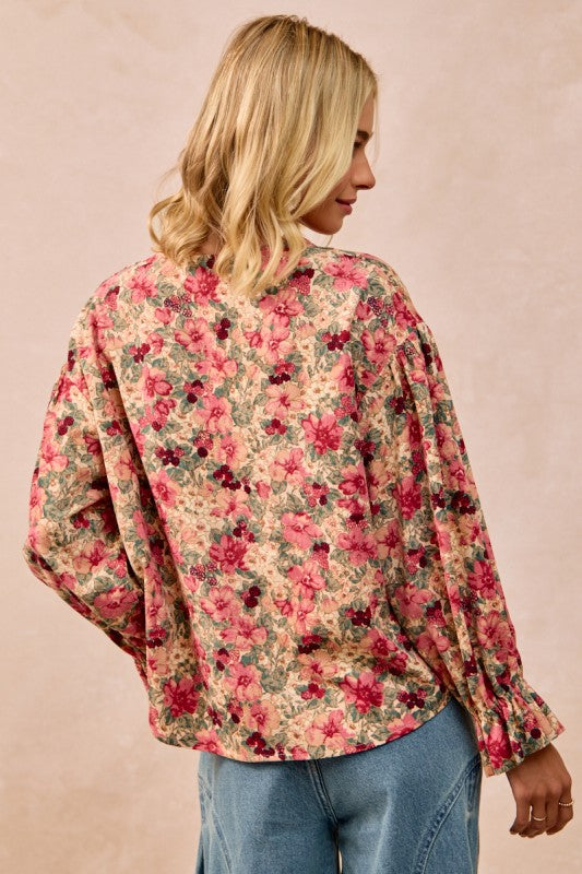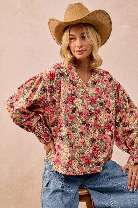 Embrace vintage charm with this Rosewood Corduroy blouse, splashed with a romantic floral print in pinks, reds, and greens. Its soft, textured fabric and billowy sleeves create a cozy, dreamy vibe, while the playful V-neck buttons add a flirty touch. Perfect for layering or wearing solo, it pairs effortlessly with jeans or skirts for a whimsical, laid-back look that feels like a stroll through a sunlit garden.