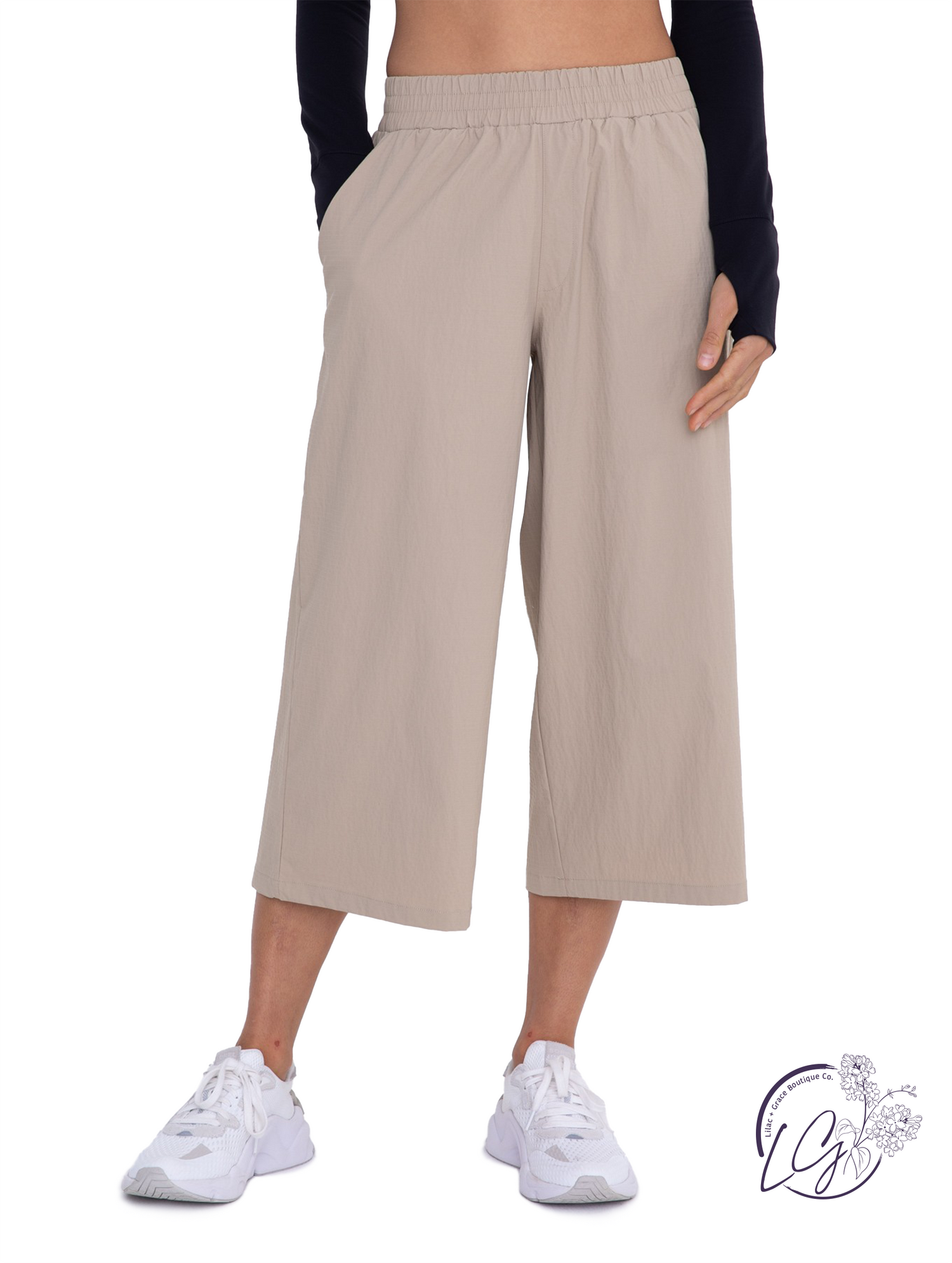Stay cool and stylish with our Run Wild Wide Leg Pants! Crafted from a durable, stretch rib stop fabric, these pants feature convenient slash pockets and an elastic waistband for all-day comfort. With a faux fly stitching and cropped wide flared leg, these pants are perfect for any adventure - plus, they're water resistant!