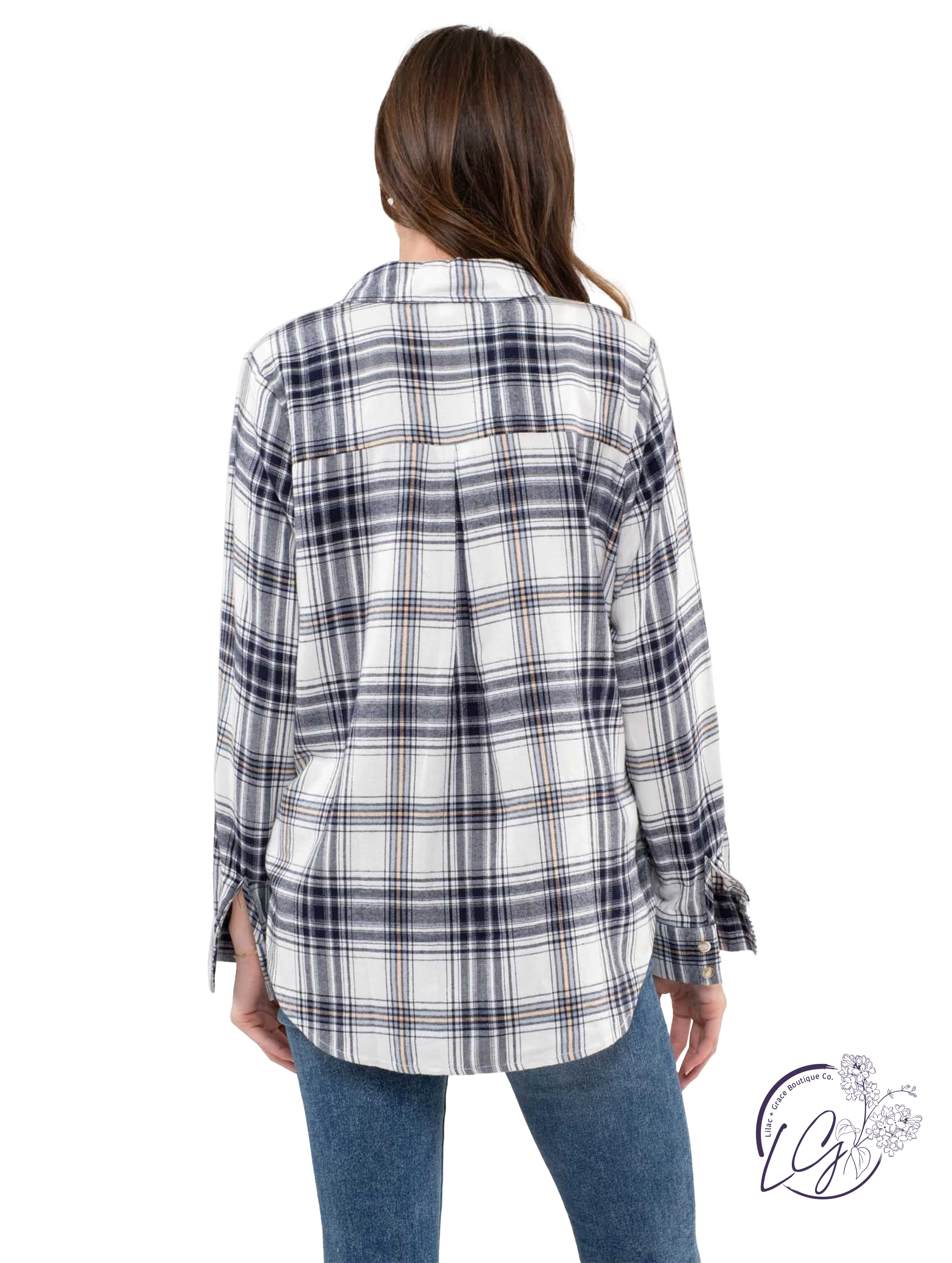 The Rustic Plaid Button Down is a casual yet stylish shirt crafted from a breathable fabric, typically cotton or a blend, featuring a classic plaid pattern. It usually has a relaxed fit, making it comfortable for everyday wear. The lightweight material ensures breathability, making it suitable for warmer weather. The button-down design allows for easy layering and styling, making it versatile for various occasions, from casual outings to outdoor activities.