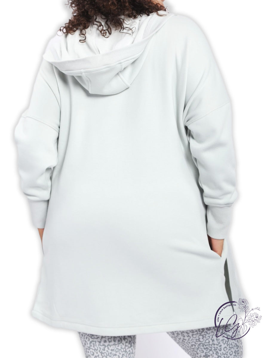 Keep yourself warm (and stylish) in this open-front cardigan. With its longline silhouette, hoodie, long sleeves with thumb holes, and luxurious fleece inner lining, this cardigan is your go-to for when temperature drops.
