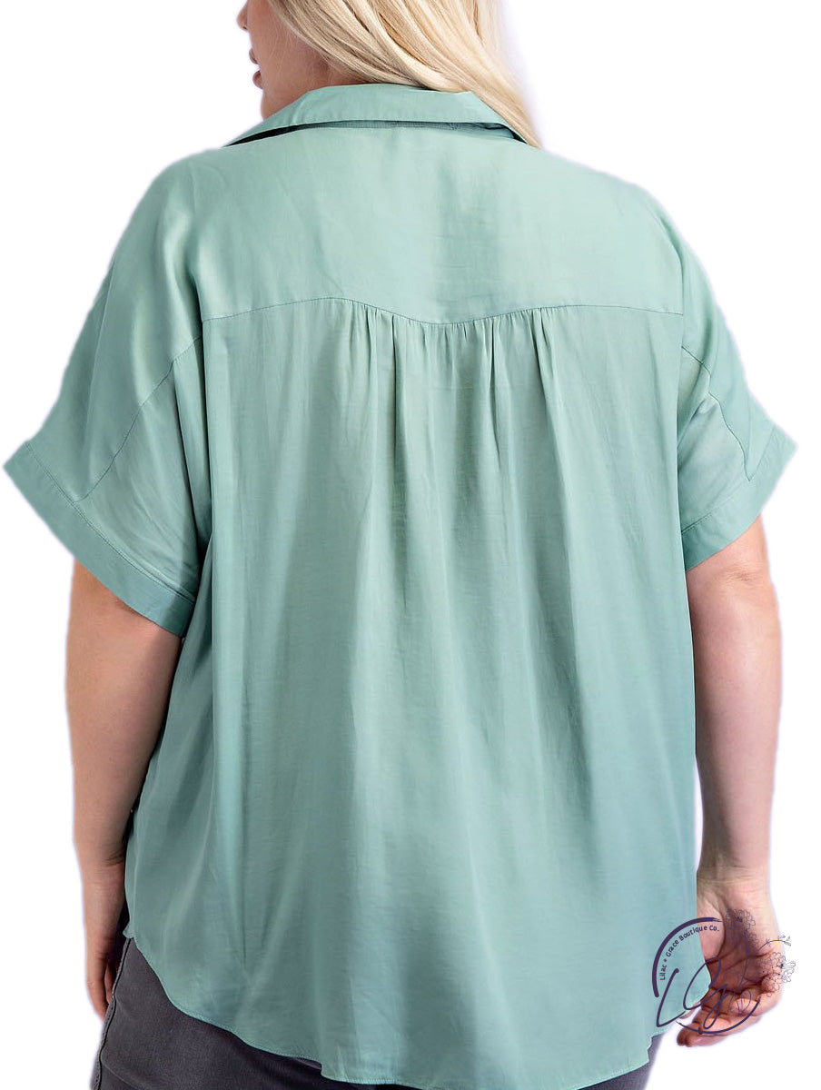 Curvy short sleeve blouse top made in a light weight, airy fabric with a collared + v-neckline.