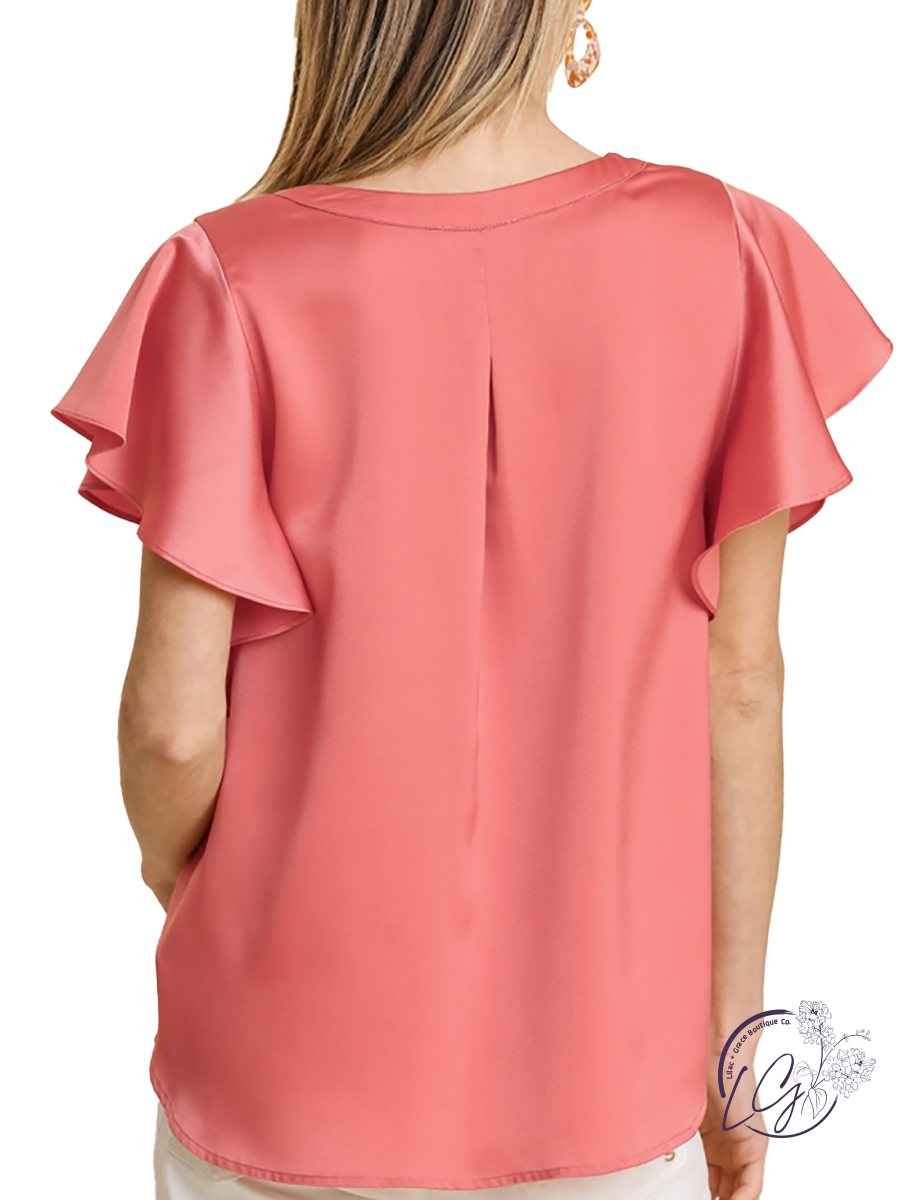 Satin Split V-Neck Short Ruffle Sleeve Top