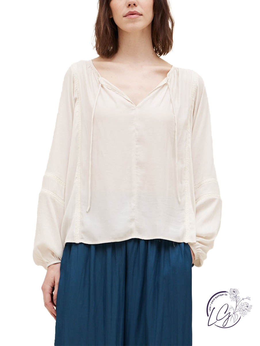 The "Satin Flair Inset Blouse" epitomizes understated sophistication with a touch of flair. Crafted from luxurious satin fabric, this blouse offers a lustrous sheen that catches the light with every movement, adding a touch of opulence to your ensemble.