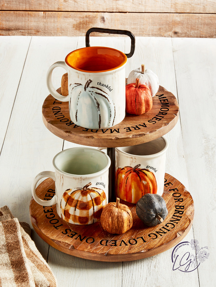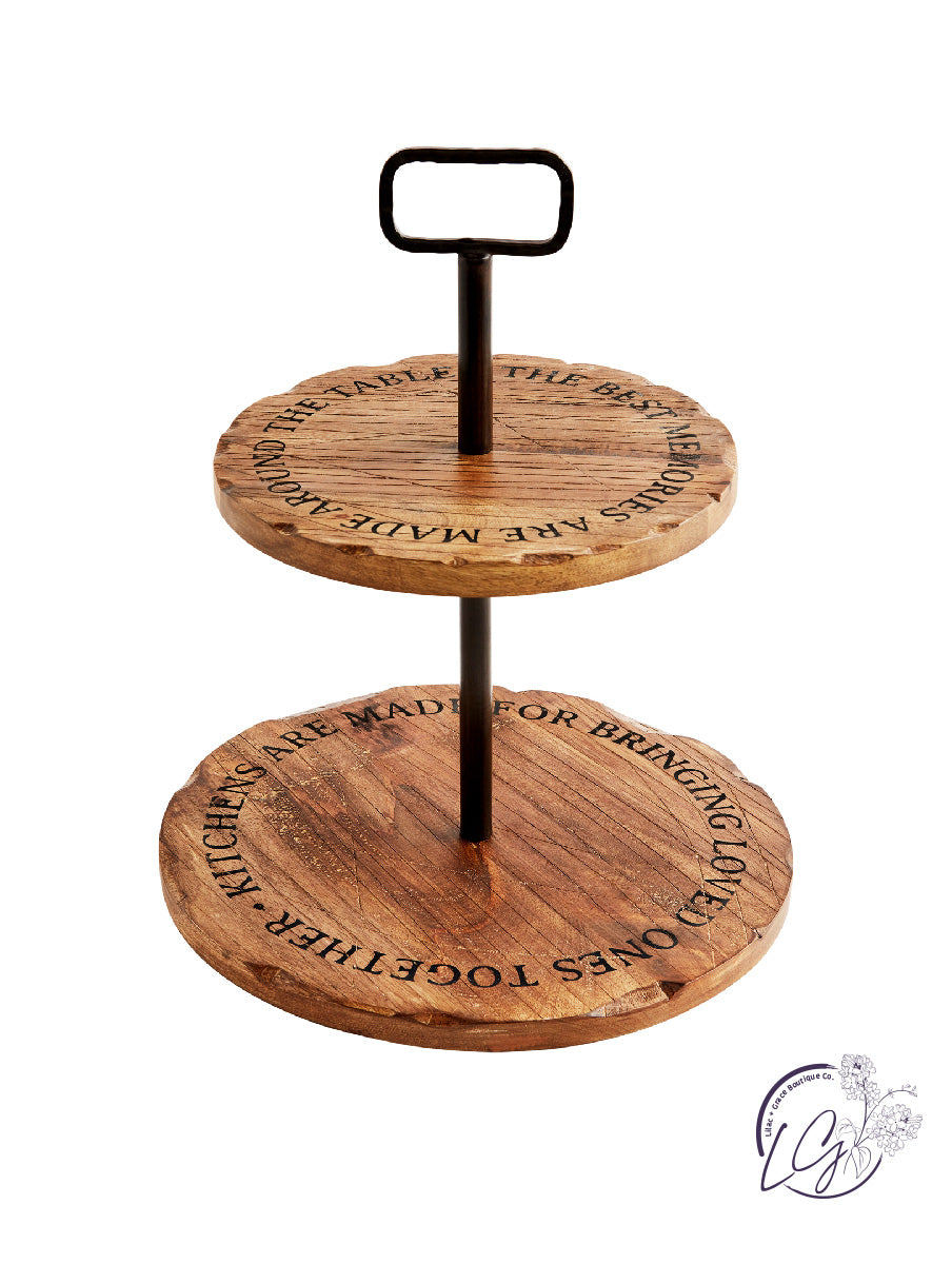 Two-tier mango wood server with metal center rod handle.