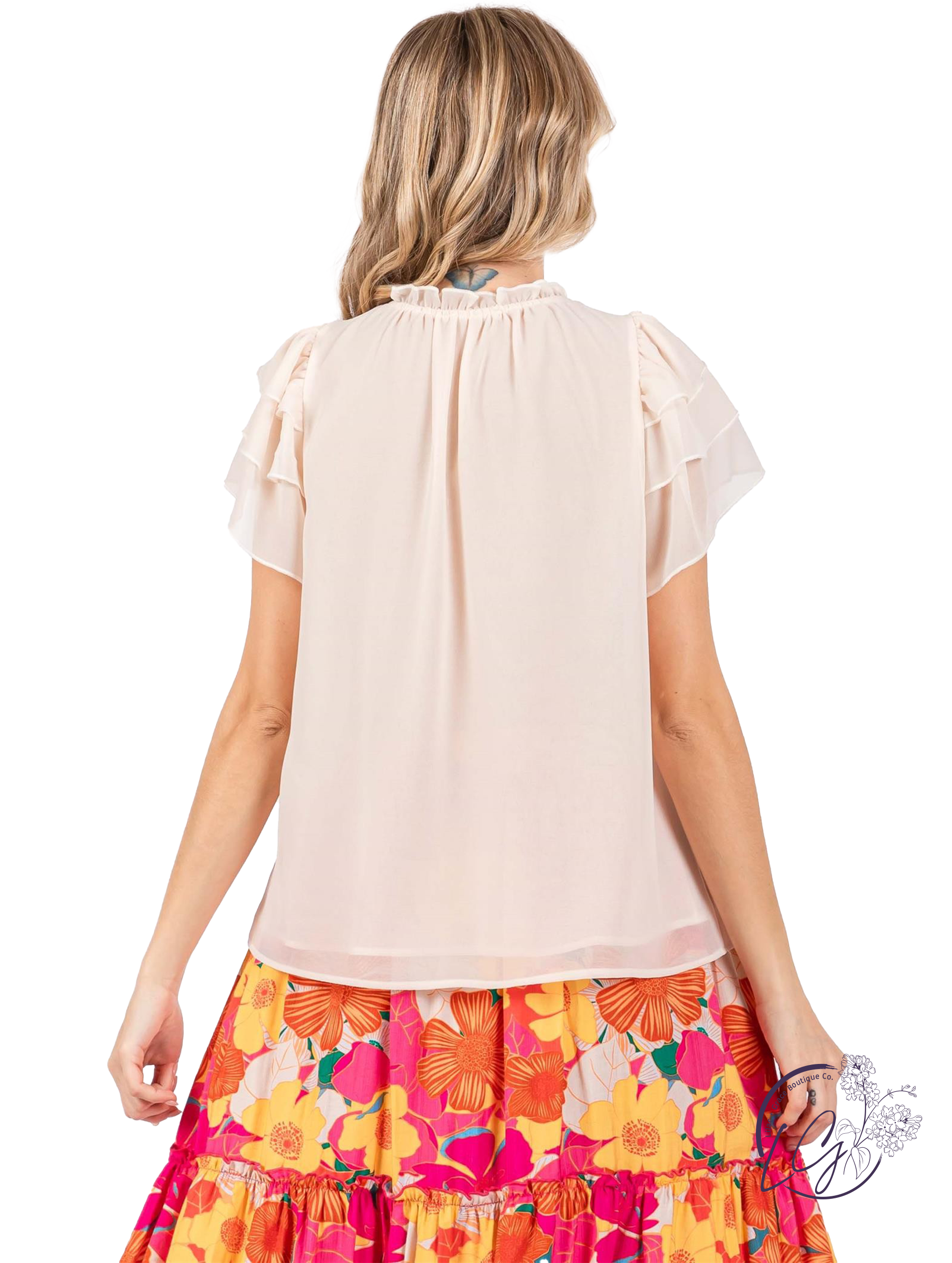 Dress up your curves in the Serene Bows Sheer Top. This plus size blouse features a playful ribbon tie detail and layered short sleeves. The split mock neck adds a touch of sass, while the comfy lining inside makes it perfect for daily wear. A solid and sheer combo for a stylish statement.