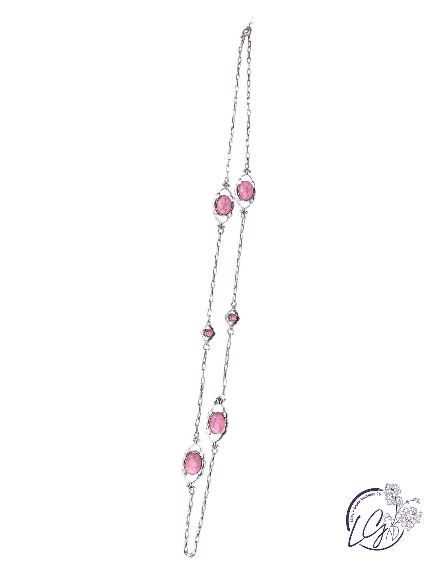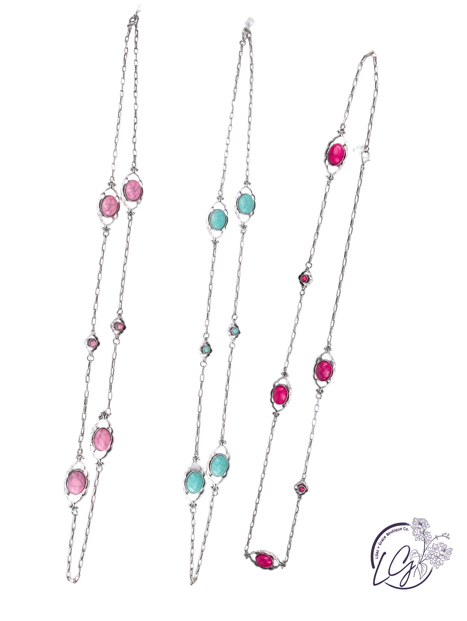 Bring vintage charm to your everyday look with the Sierra Trails Pendant Necklace. This 15-inch necklace features an antique silver chain with oval stone settings spaced throughout, offering a blend of rustic elegance and southwestern flair. Choose from vibrant turquoise, soft pink, or bold fuchsia stones to complement your style. Lightweight yet striking, it layers beautifully or shines on its own. Finished with a lobster clasp for secure wear.