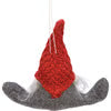 A set of two felt sitting gnomes with red knit hats, fluffy beards, and fabric noses for added interest. Small gnome features a string loop for easy hanging and makes a perfect Christmas ornament. Set pairs well with other holiday gnome items for a cohesive Christmas display.