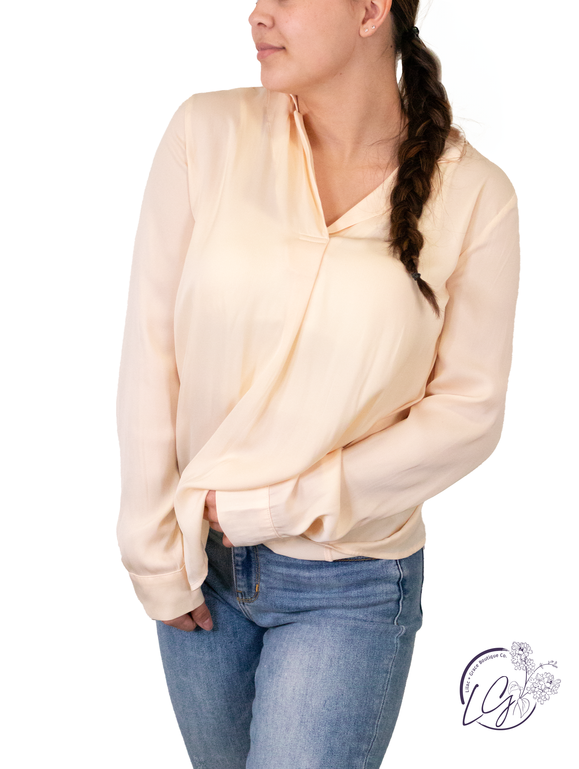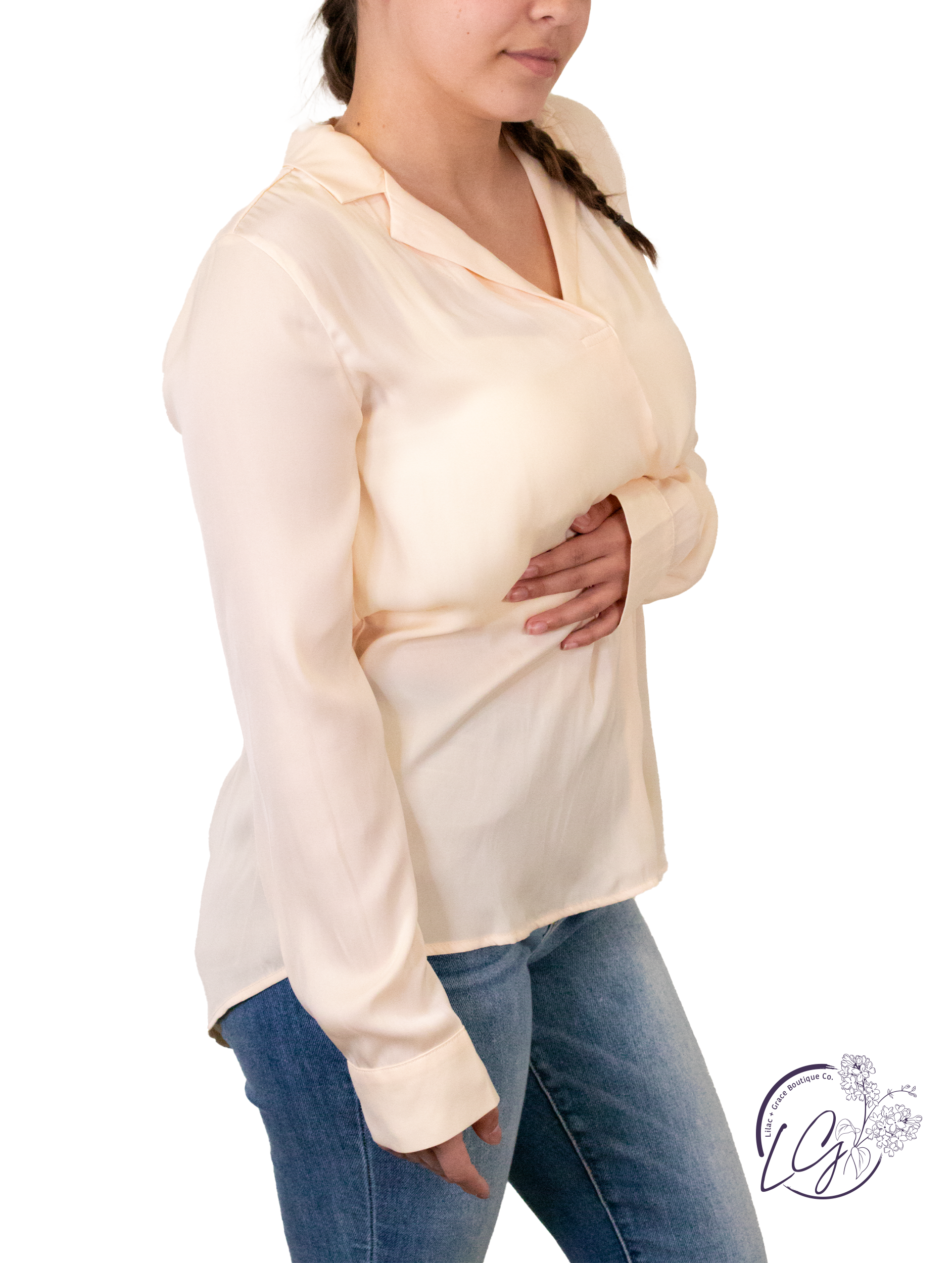 Indulge in the glamour of urban elegance with the Skyline Satin Perfection Blouse. Crafted with meticulous attention to detail, this long-sleeve open-collar blouse exudes a timeless sophistication. The statuesque fabric provides a silky-smooth touch, creating a luxurious drape that enhances the overall elegance of the garment.