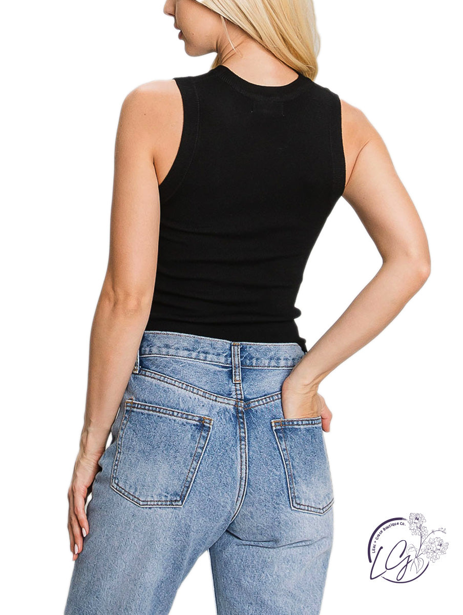 Sleeveless knit top made with round neck and tight fitting silhouette. The ribbed top has rib hemming at the neck and a rounded bottom.