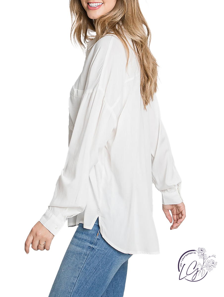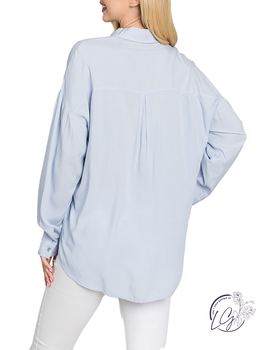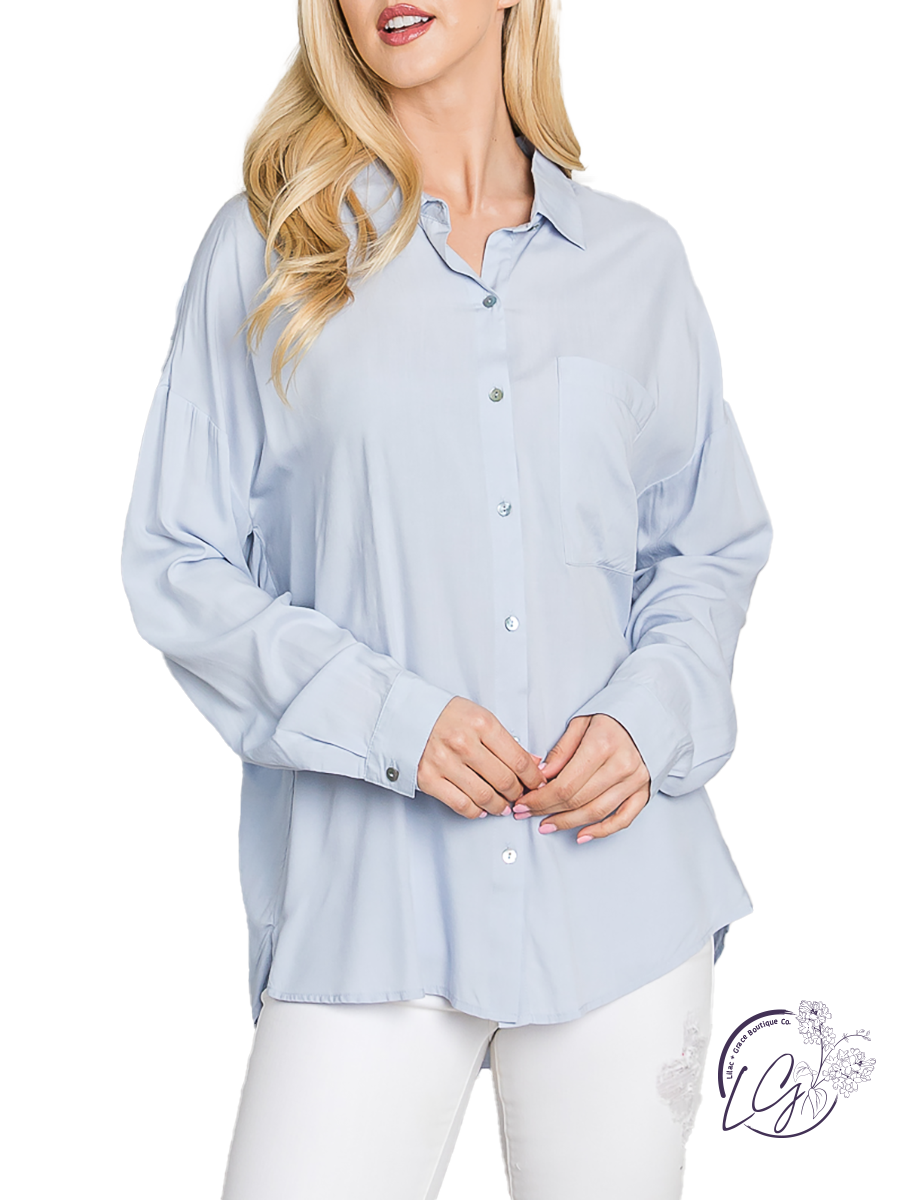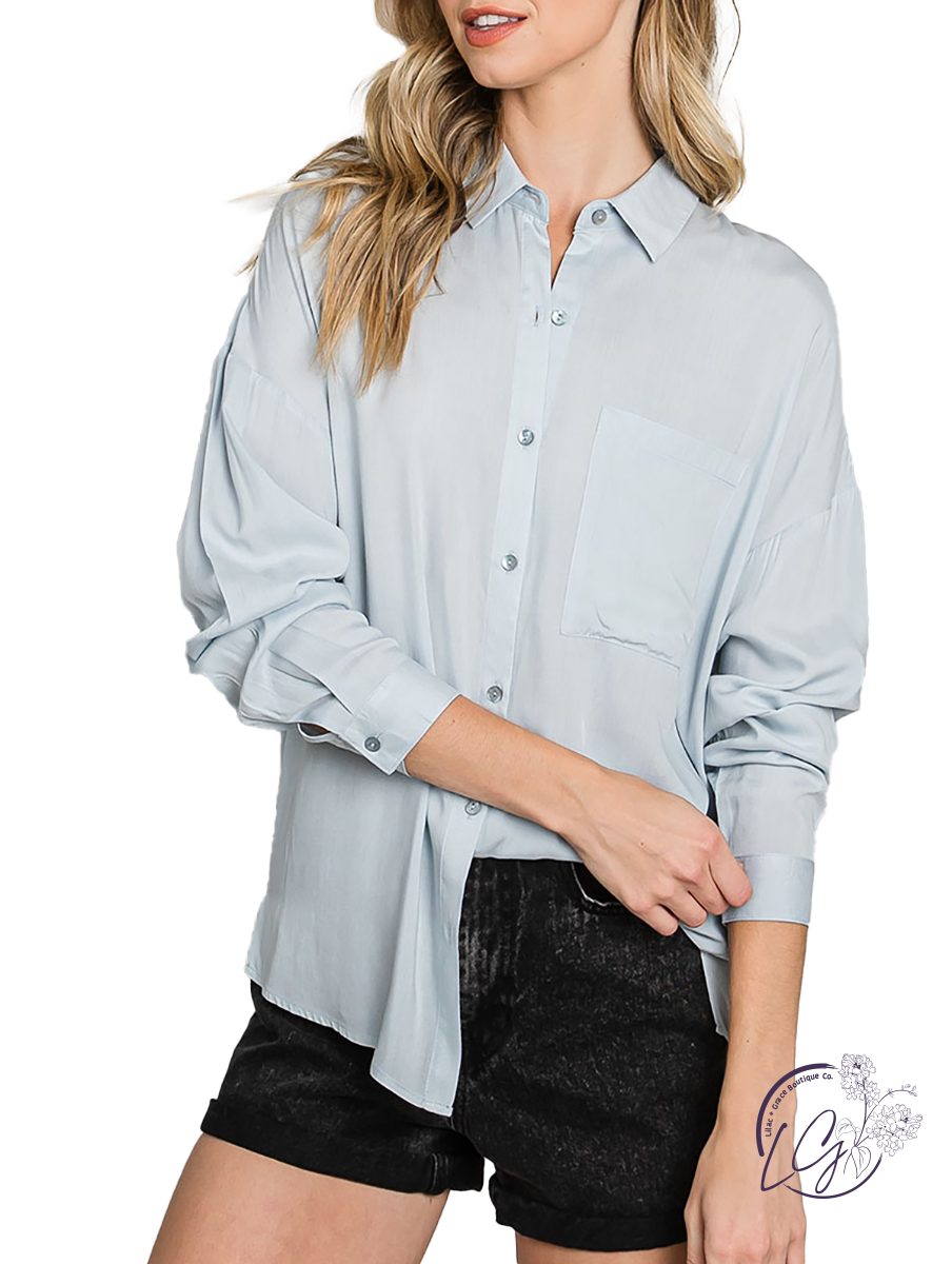 Boyfriend Button Down Shirt made with Drop Shoulder and Front Pocket. The Loose Fitted Shirt is very Lightweight with a Satin-Like Material.