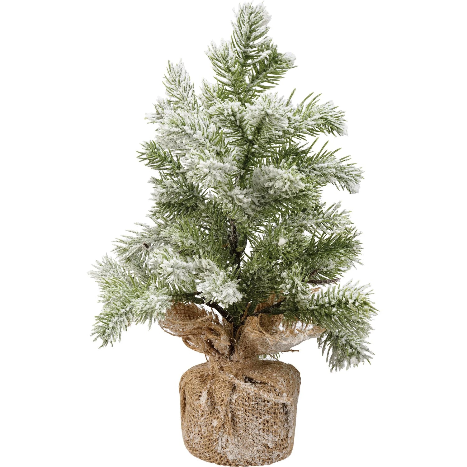 A small faux evergreen tree featuring a flocked coating for a snowy effect. Our small green Christmas tree with snow has a burlap-wrapped base for added interest.