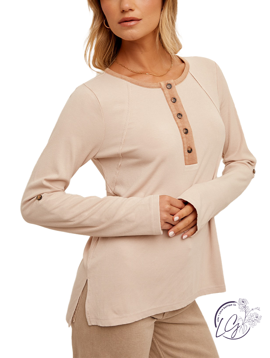 The Cozy Chill Tee features color block detailing and roll-tab sleeves, adding a touch of style to its cozy design. Crafted from ribbed fabric, it offers a snug and comfortable fit. Perfect for casual days or lounging at home, this tee combines warmth and fashion effortlessly.
