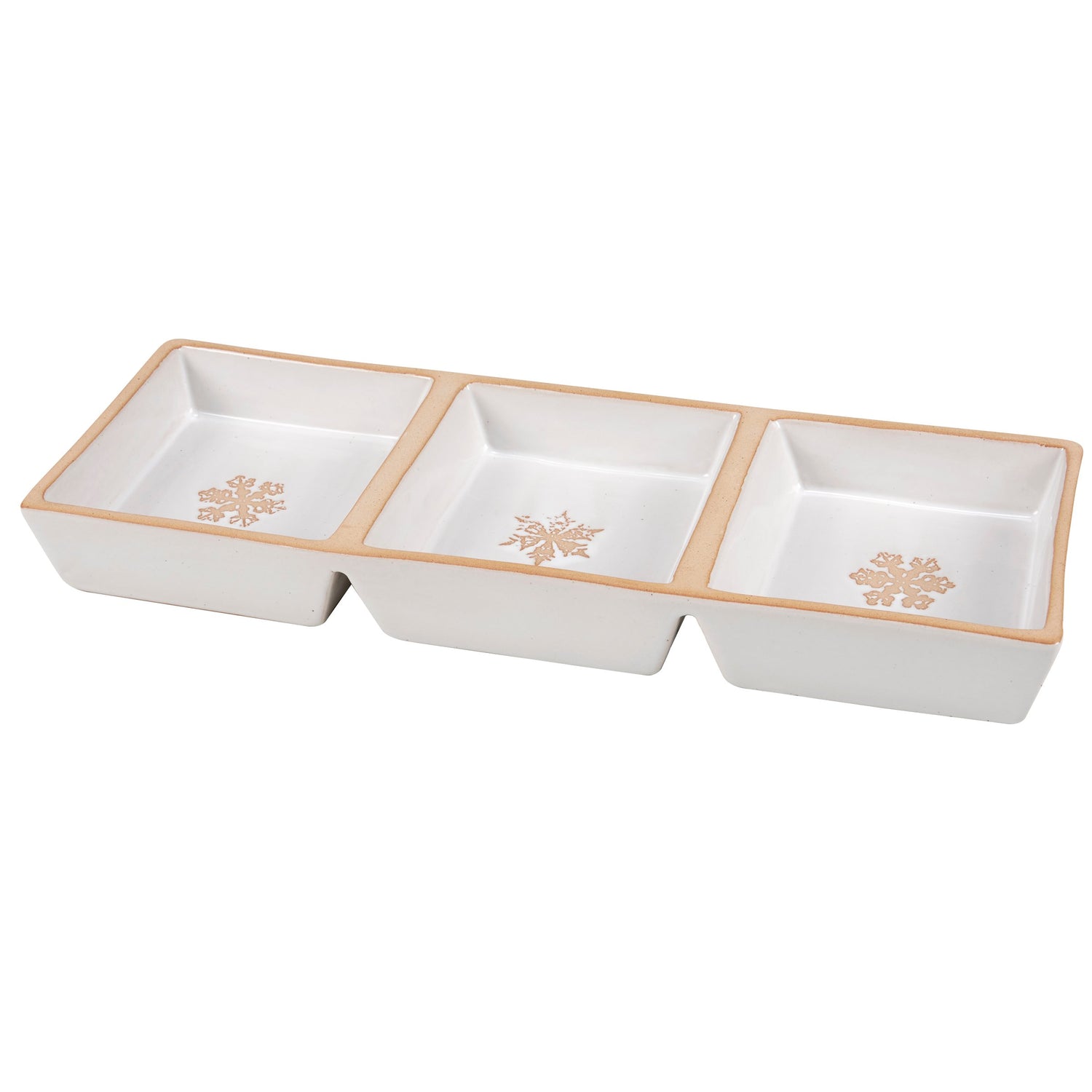 A snowy cream color with debossed snowflakes in brown color on the inside and bare ceramic accents on the rim. Tray features three sections to easily sort food. Our Snowflakes tidbit tray is microwave, dishwasher, and food safe for convenient use. A piece of rustic tableware perfect for seasonal gatherings.