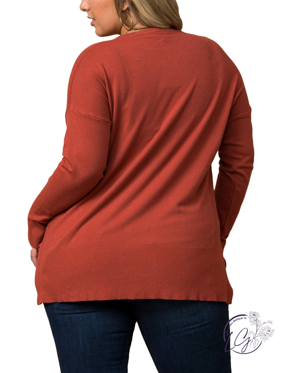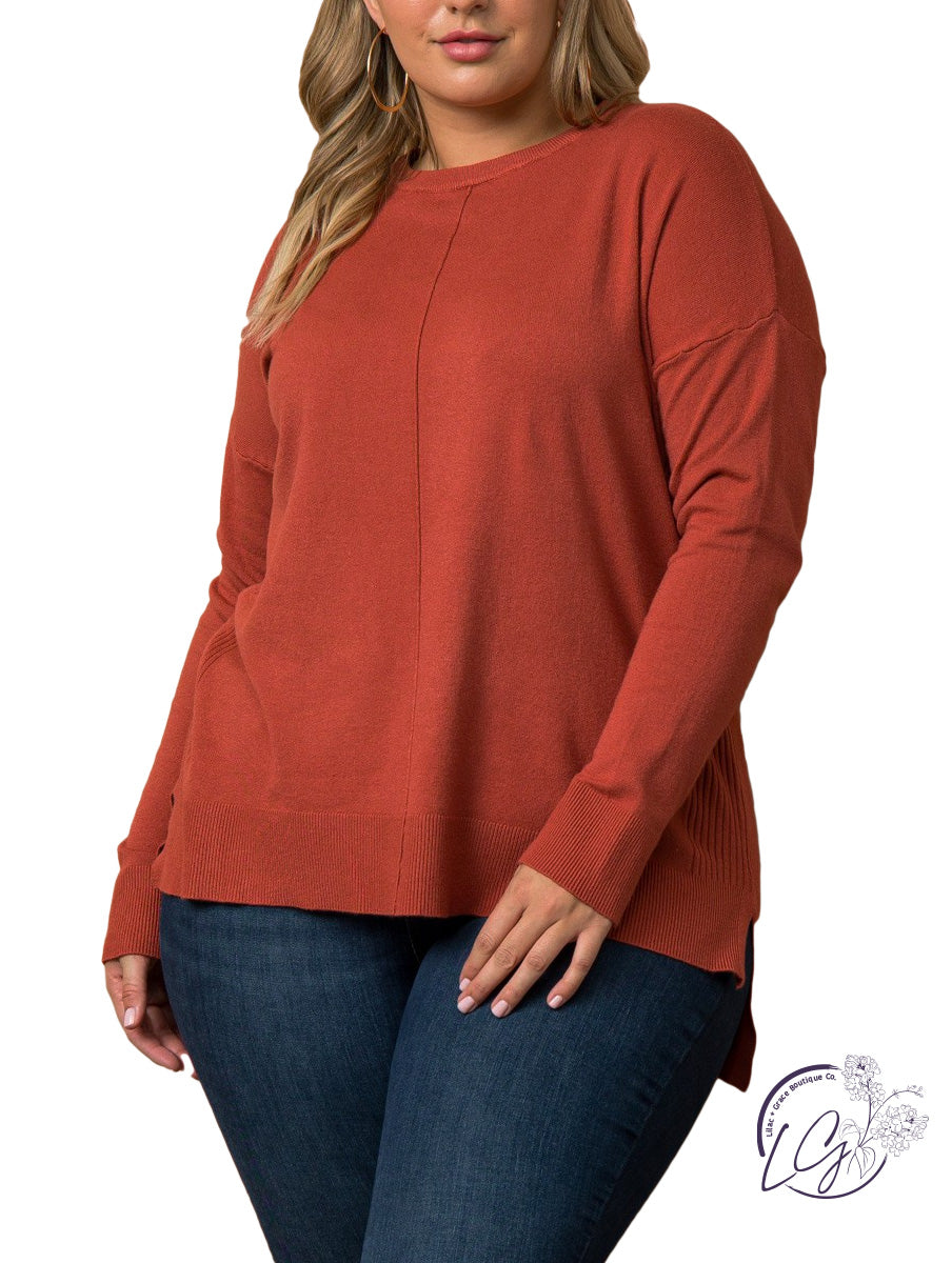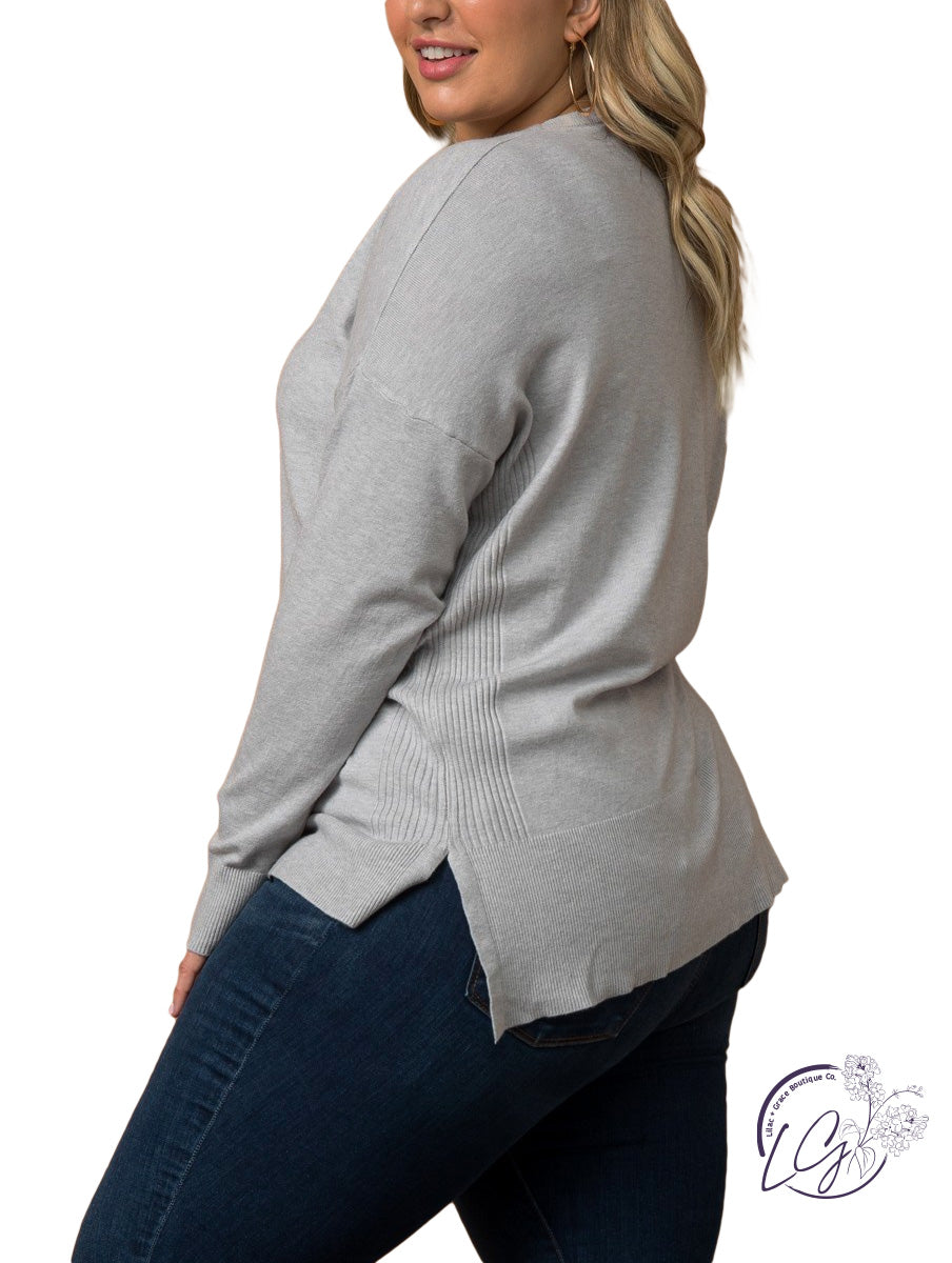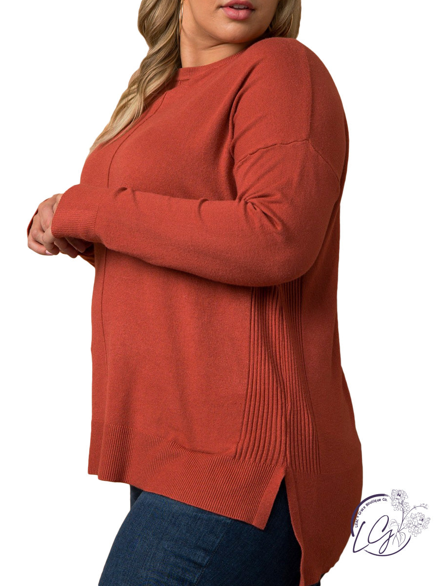 Soft Knit Sweater with Exposed Center Seam and Side Ribbed Detail