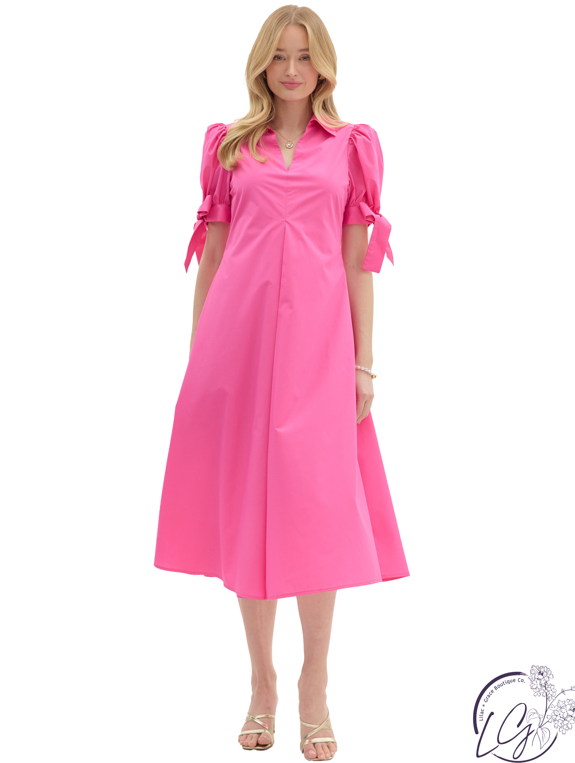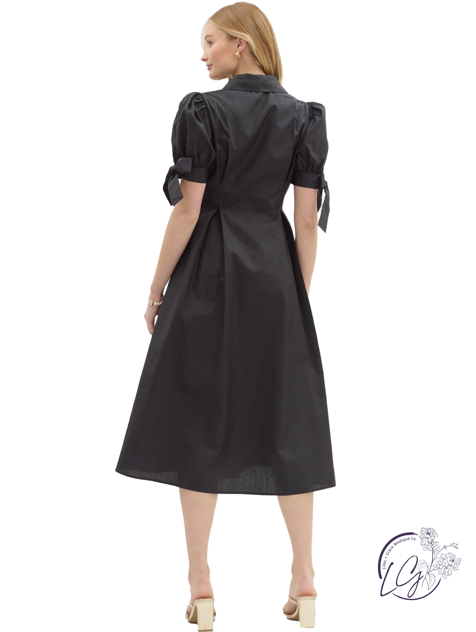 This solid midi dress features a split collar V-neckline and a front pleat that adds gentle structure to the silhouette. Short puff sleeves are finished with bow tie bands for a soft, feminine touch, while a side zipper closure ensures a clean fit. Light and refined, it's perfect for both everyday wear and dressed-up moments—just add your favorite heels or flats.