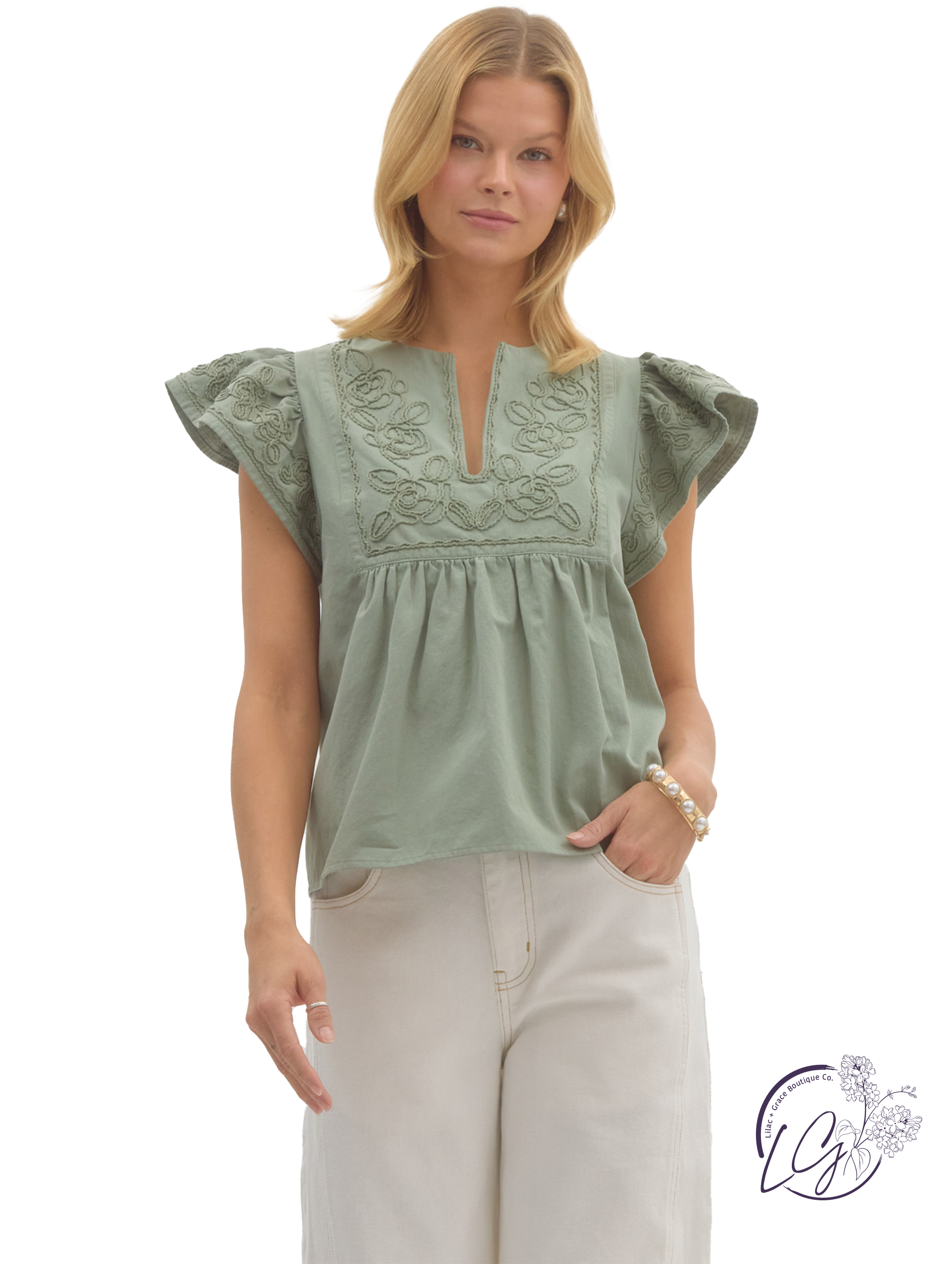 This solid pullover top features a soft split neckline and flutter sleeves, finished with delicate applique detailing for subtle texture. Crafted from a lightweight woven fabric, it’s unlined, non-sheer, and perfect for warm-weather layering.