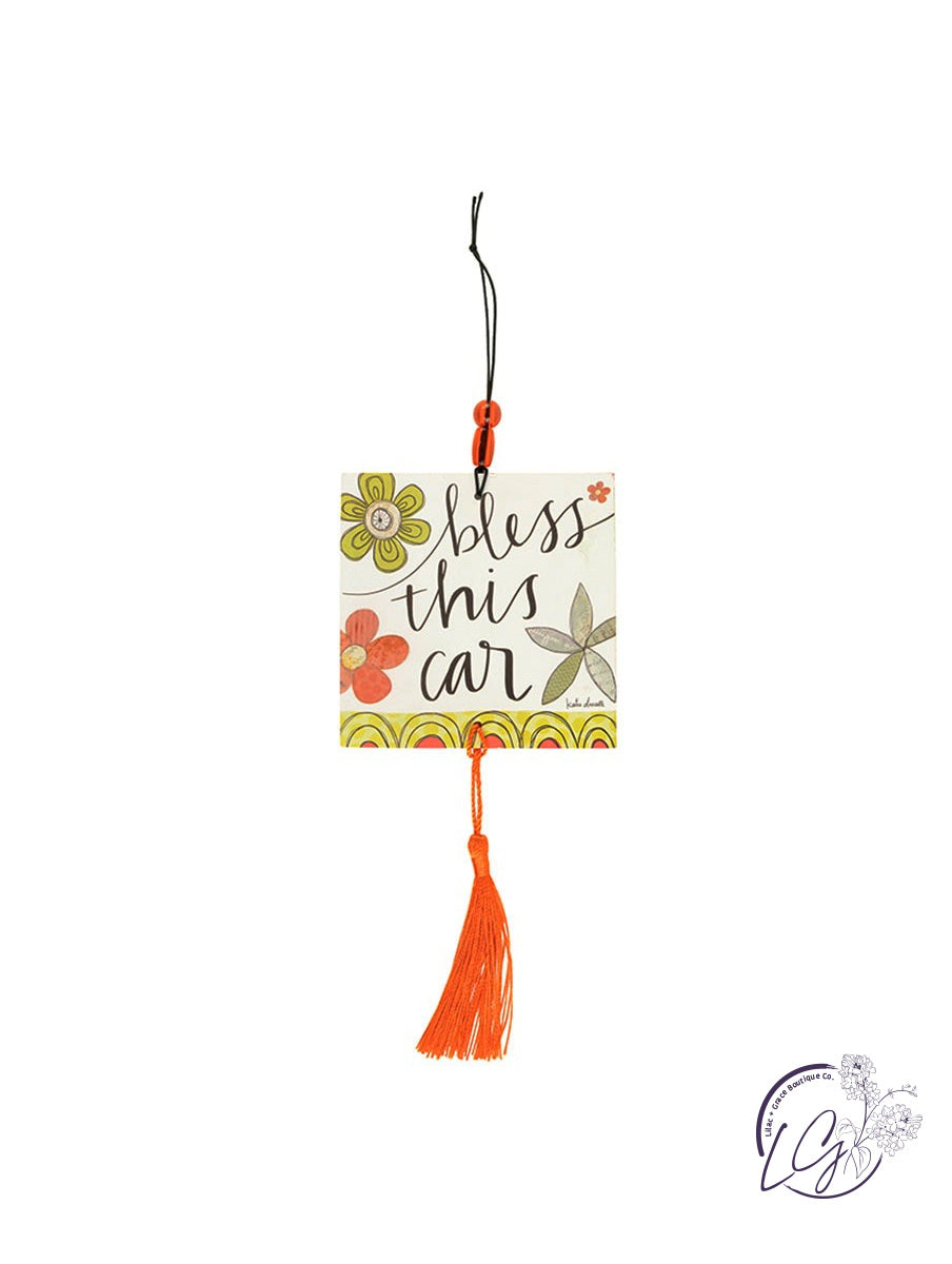 Cute and inspirational air fresheners feature a stretchy band, two colored beads, a coordinating tassel and “Bless this car” sentiment on both sides.