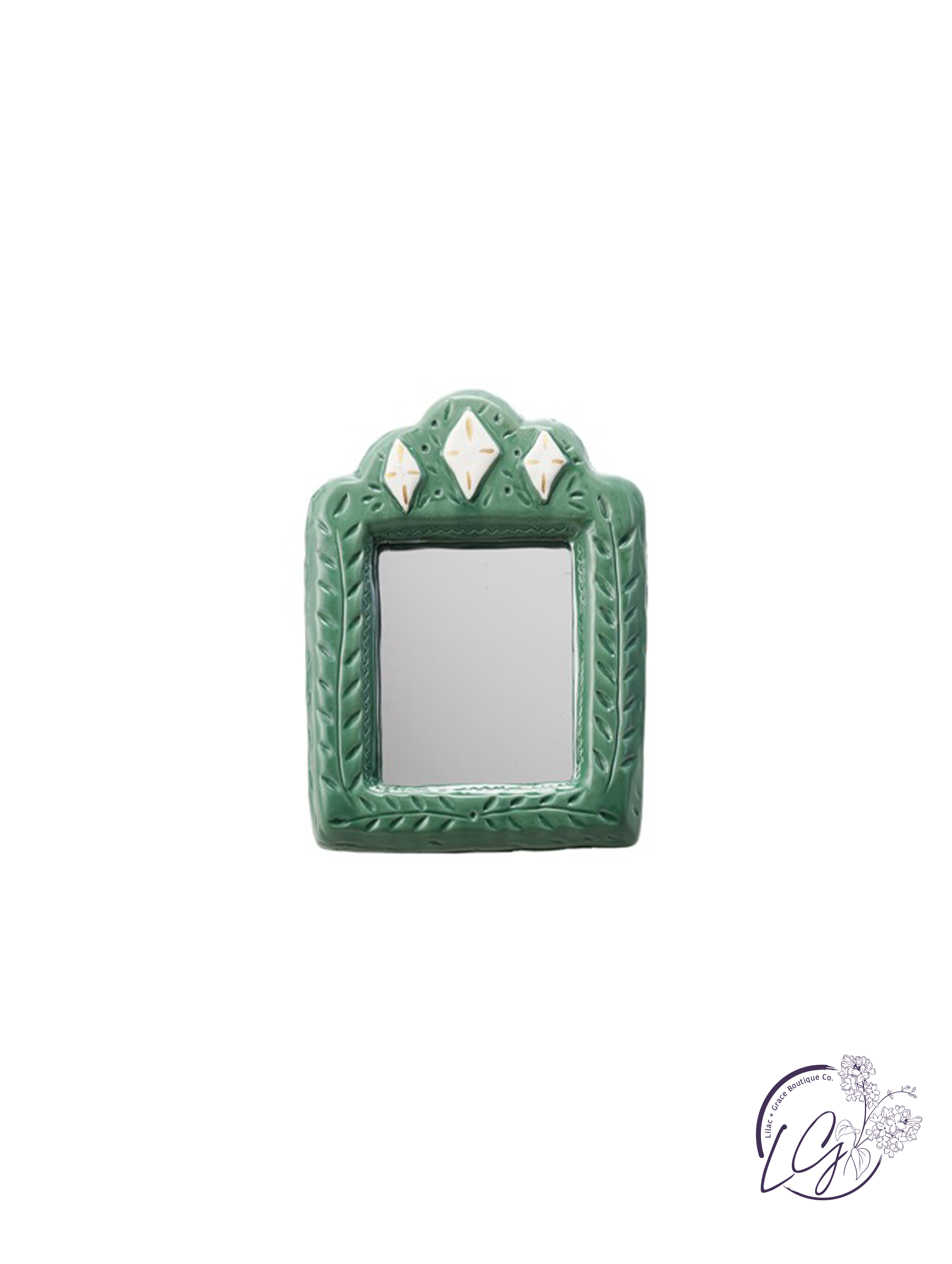 Add a touch of sophistication and glamour to your home with this exquisite stoneware mirror. The gold electroplating adds a luxurious touch, while the intricate detailing creates a stunning focal point in any room. Measuring 7-1/2 inches in width and 5-3/4 inches in height, this mirror is the perfect size for adding a touch of elegance to your space. Whether displayed in a hallway, bedroom, or living room, this mirror is sure to make a statement and impress your guests with its beauty and style. Elevate your home decor with this gorgeous stoneware mirror today.