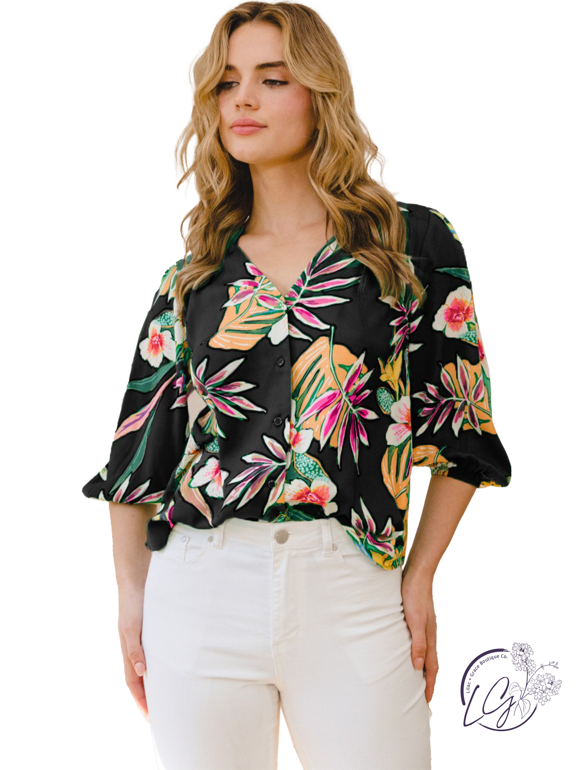 Experience the thrill of the Sunlit Shores Call Blouse! This bold and beautiful v-neck blouse features a striking floral print, exuding confidence and daring. With 3/4 sleeves and a button down closure, you'll feel ready to take on any challenge and embrace your adventurous spirit.