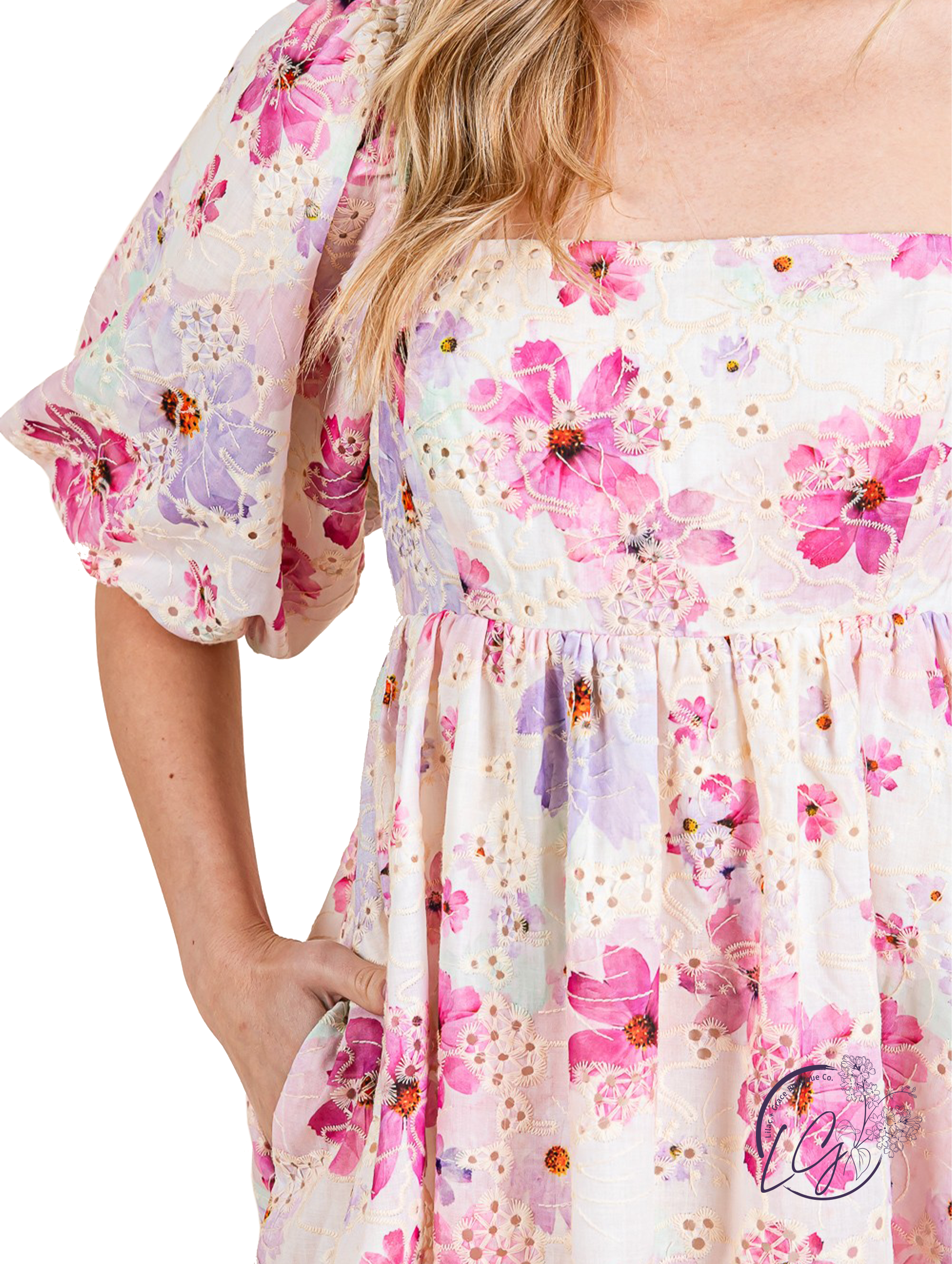 Get ready for a daring adventure with our floral print eyelet laced babydoll dress! This mini dress features a square neck and puff sleeves with delicate embroidery, while the smocking and elastic back ensures a snug fit. Perfect for daily wear or a charming picnic outfit. Feel cute, lovely, and stylish in this bubble skirt style dress. Sizes available for young contemporary and contemporary women.