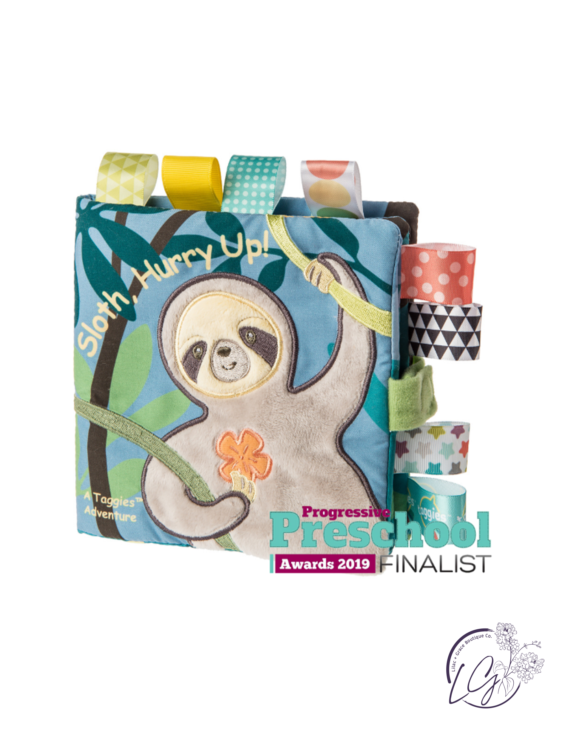 Taggies books are winning awards for their combination of stimulation (squeaker and crinkle paper inside) and soothing features (eight Taggies ribbons and textured fabric covers). Each book tells a short, sweet story in eight pages with Velcro® closure.