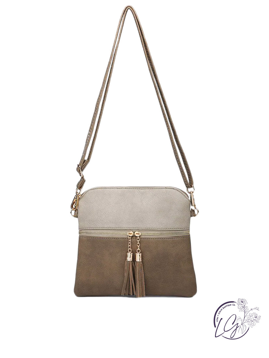 This zippered, tassel bag has a removable/adjustable shoulder strap, gold tone hardware, and a zipper top closure. It also has plenty of pockets! Dimensions: 9.5"L x 0.5"D x 9"H