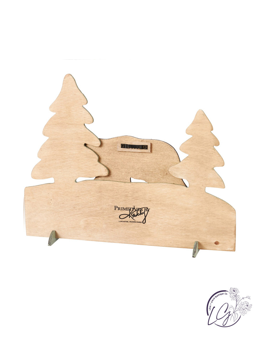 A wooden wall décor piece featuring wood cutouts placed together to create a scene of a bear in the woods with "Adventure Awaits" sentiment on the bottom. Our Adventure Awaits wall décor is easy to hang via the attached sawtooth hanger or sit using included stands. A charming everyday home accent perfect for an outdoor theme.