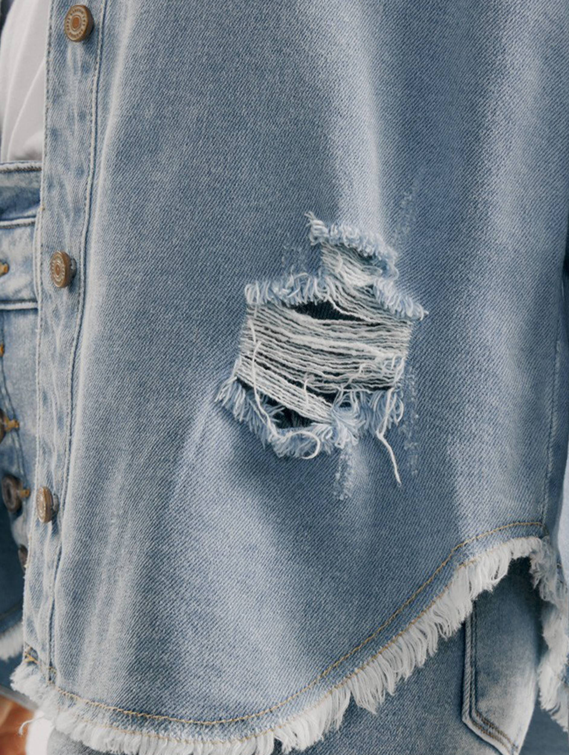 Unleash your inner cowboy with our Western Denim Button Down Shirt! Made with comfort stretch and a frayed hem, this light-wash shirt also features a stylish sleeve slit and distressed details. Plus, the added front pocket makes it both fashionable and functional. Look effortlessly cool in our unique take on a classic style. Yeehaw!