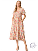 Soft and romantic, this floral printed midi dress features a smocked back and ruched bust for a flattering, form-hugging fit. The sweetheart neckline and gentle gathers add a feminine touch, while the flowy midi-length skirt offers graceful movement. Perfect for daytime dates or weekend outings, pair it with sandals and simple jewelry for an effortlessly pretty look.