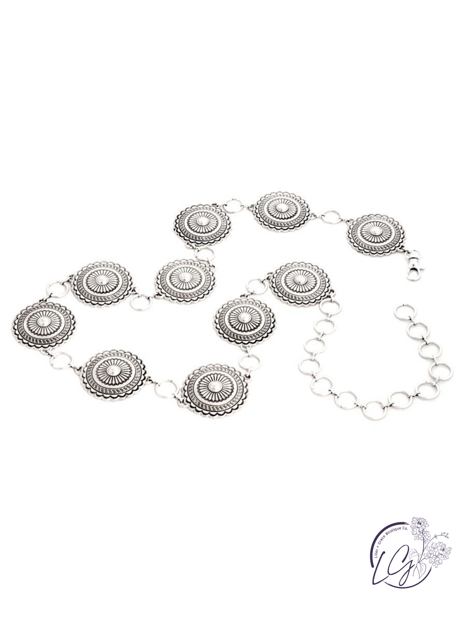 This concho chain belt is all about movement and metal—engraved silver conchos linked with draping chains for a look that’s both rugged and refined. The lightweight feel and adjustable fit make it easy to throw on and go.