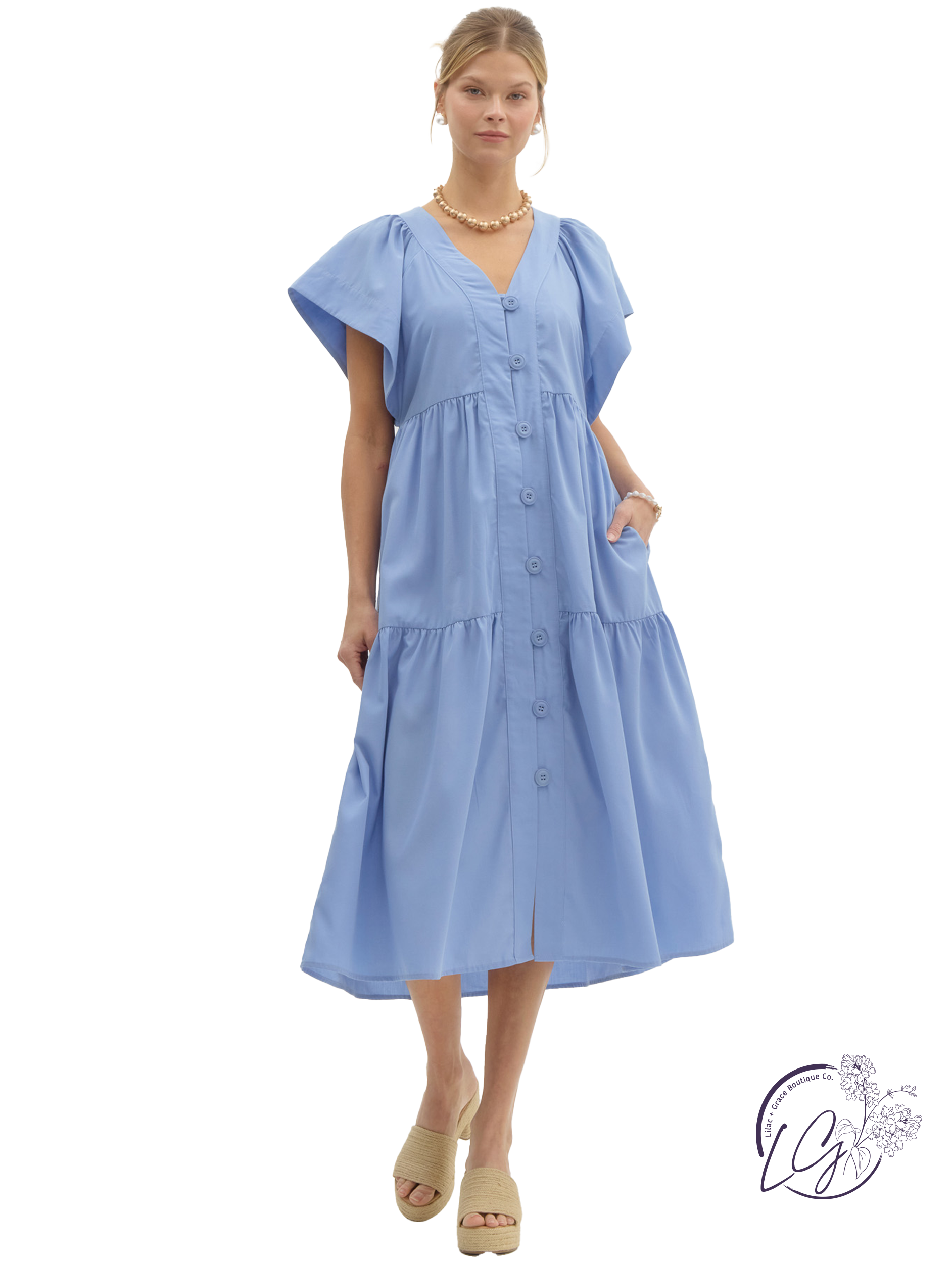 This solid tiered midi dress features a soft V-neckline and flutter sleeves for a light, airy silhouette. Oversized front buttons add bold detail to the flowing tiers, while the mid-length cut makes it perfect for warm days or casual gatherings. Pair it with sandals or flats for a breezy, laid-back look.